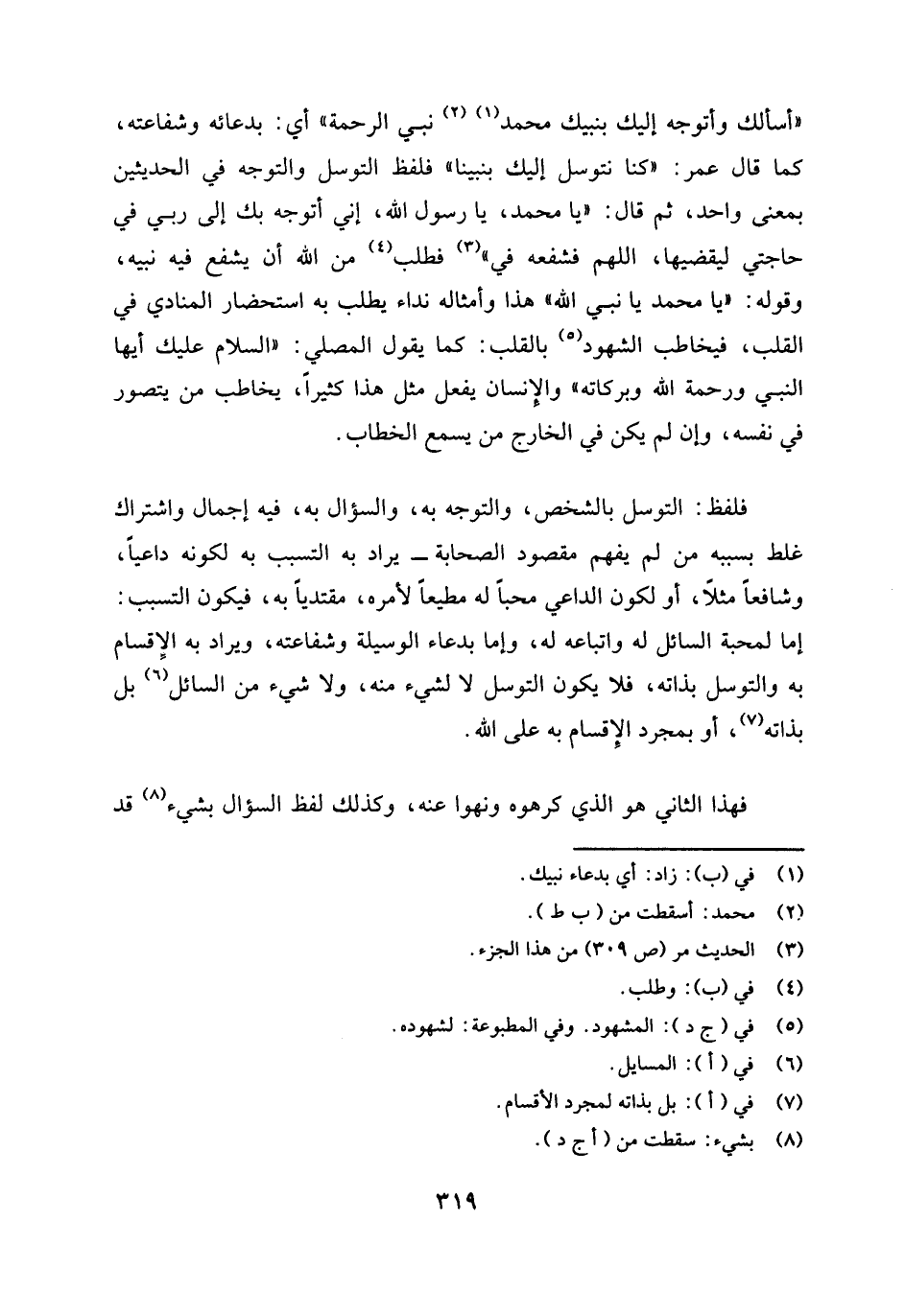فلفظ التوسل بالشخص، والتوجه به، والسؤال به، فيه إجمال واشتراك، غلط بسببه من لم يفهم مقصود الصحابة، يراد به التسبب به لكونه داعيا وشافعا مثلا، أو لكون الداعي مجيبا له، مطيعا لأمره، مقتديا به، فيكون التسبب: إما لمحبة السائل له واتباعه له، وإما بدعاء الوسيلة وشفاعته، ويراد به الإقسام به والتوسل بذاته، فلا يكون التوسل لا لشيء منه، ولا شيء من السائل (¬5) بل بذاته (¬6) أو بمجرد الإقسام به على الله.