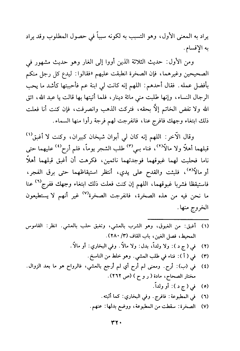ومن الأول: حديث الثلاثة الذين أووا إلى الغار، وهو حديث مشهور في الصحيحين وغيرهما، فإن الصخرة انطبقت عليهم " فقالوا: ليدع كل رجل منكم بأفضل عمله، فقال أحدهم: اللهم إنه كانت لي ابنة عم فأحببتها كأشد ما يحب الرجال النساء، وإنها طلبت مني مائة دينار، فلما أتيتها بها قالت: يا عبد الله، اتق الله ولا تفض الخاتم إلا بحقه، فتركت الذهب وانصرفت، فإن كنت إنما فعلت ذلك ابتغاء وجهك فافرج عنا، فانفرجت لهم فرجة رأوا منها السماء.