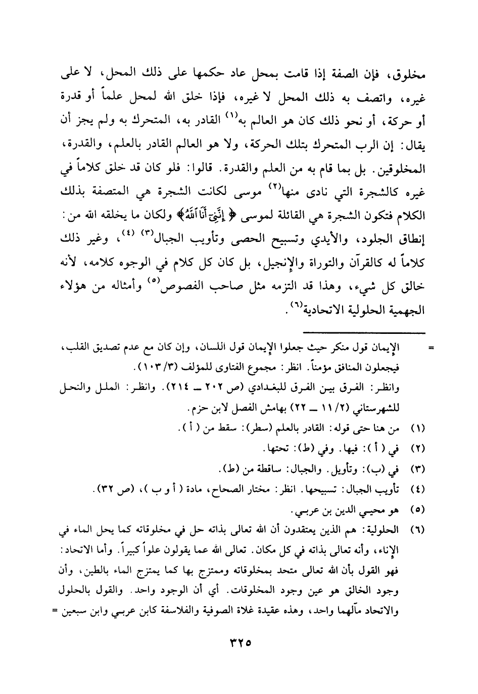 (¬5) الحلولية: هم الذين يعتقدون أن الله تعالى بذاته حل في مخلوقاته كما يحل الماء في الإناء، وأنه تعالى بذاته في كل مكان، تعالى الله عما يقولون علوا كبيرا. وأما الاتحاد: فهو القول بأن الله تعالى متحد بمخلوقاته وممتزج بها كما يمتزج الماء بالطين، وأن وجود الخالق هو عين وجود المخلوقات، أي أن الوجود واحد. والقول بالحلول والاتحاد مآلهما واحد، وهذه عقيدة غلاة الصوفية والفلاسفة، كابن عربي وابن سبعين والحلاج والتلمساني وغيرهم. انظر: مجموع الفتاوى للمؤلف (2 / 111 - 480) .