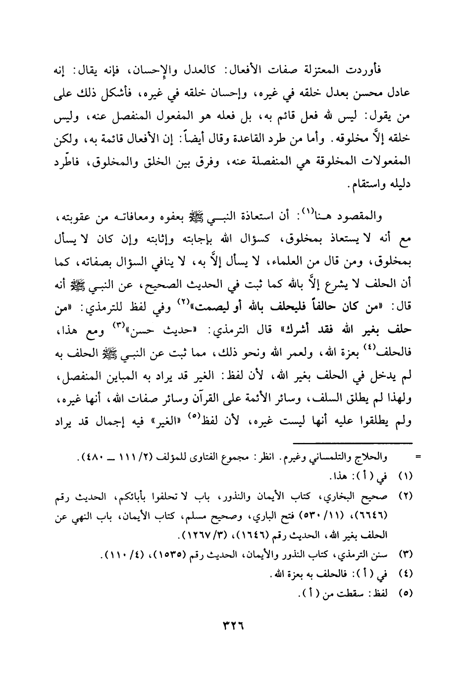 والمقصود هنا (¬1) أن استعاذة النبي صلى الله عليه وسلم بعفوه ومعافاته من عقوبته، - مع أنه لا يستعاذ بمخلوق - كسؤال الله بإجابته وإثابته، وإن كان لا يسأل بمخلوق. ومن قال من العلماء: لا يسأل إلا به، لا ينافي السؤال بصفاته، كما أن الحلف لا يشرع إلا بالله، كما ثبت في الحديث الصحيح، عن النبي صلى الله عليه وسلم أنه قال: «من كان حالفا فليحلف بالله أو ليصمت» (¬2) وفي لفظ للترمذي: «من حلف بغير الله فقد أشرك» قال الترمذي: " حديث حسن " (¬3) ومع هذا، فالحلف (¬4) بعزة الله، ولعمر الله، ونحو ذلك مما ثبت عن النبي صلى الله عليه وسلم الحلف به، لم يدخل في الحلف بغير الله؛ لأن لفظ (الغير) قد يراد به المباين المنفصل، ولهذا لم يطلق السلف وسائر الأئمة على القرآن وسائر صفات الله، أنها غيره، ولم يطلقوا عليه أنها ليست غيره؛ لأن لفظ (¬5) (الغير) فيه إجمال، قد يراد