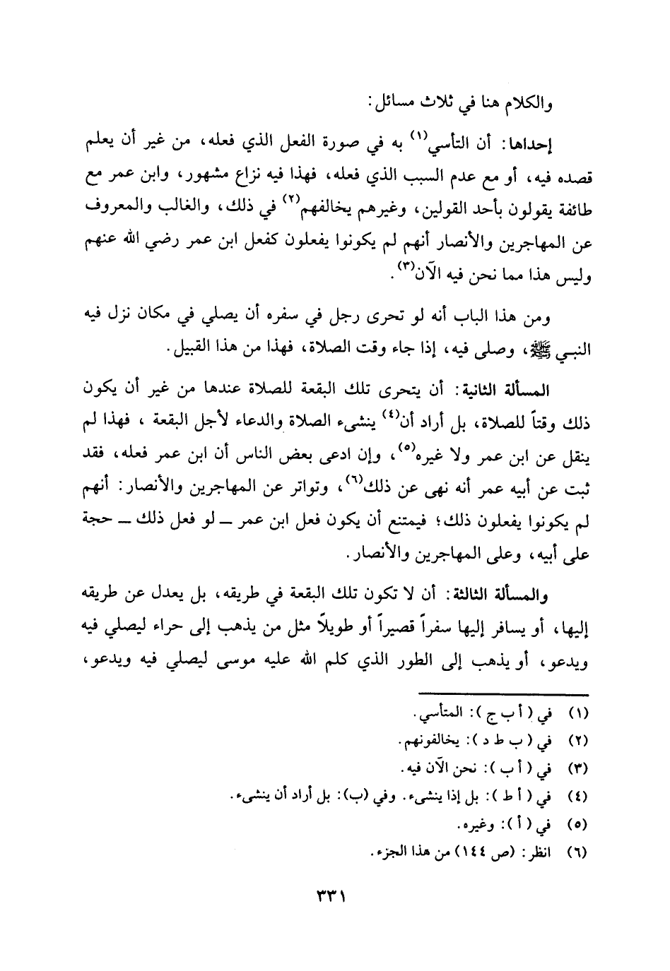 المسألة الثانية: أن يتحرى تلك البقعة للصلاة عندها من غير أن يكون ذلك وقتا للصلاة، بل أراد أن (¬4) ينشئ الصلاة والدعاء لأجل البقعة، فهذا لم ينقل عن ابن عمر ولا غيره (¬5) وإن ادعى بعض الناس أن ابن عمر فعله، فقد ثبت عن أبيه عمر أنه نهى عن ذلك (¬6) وتواتر عن المهاجرين والأنصار: أنهم لم يكونوا يفعلون ذلك؛ فيمتنع أن يكون فعل ابن عمر - لو فعل ذلك - حجة على أبيه، وعلى المهاجرين والأنصار.