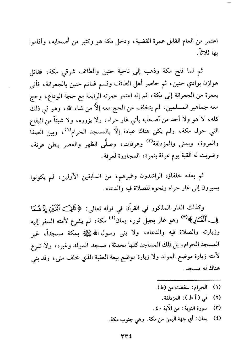 والحديبية غربيه -. ثم إنه اعتمر من العام القابل عمرة القضية، ودخل مكة هو وكثير من أصحابه، وأقاموا بها ثلاثا. ثم لما فتح مكة وذهب إلى ناحية حنين والطائف شرقي مكة، فقاتل هوازن بوادي حنين، ثم حاصر أهل الطائف وقسم غنائم حنين بالجعرانة، فأتى بعمرة من الجعرانة إلى مكة. ثم إنه اعتمر عمرته الرابعة مع حجة الوداع، وحج معه جماهير المسلمين، لم يتخلف عن الحج معه إلا من شاء الله.