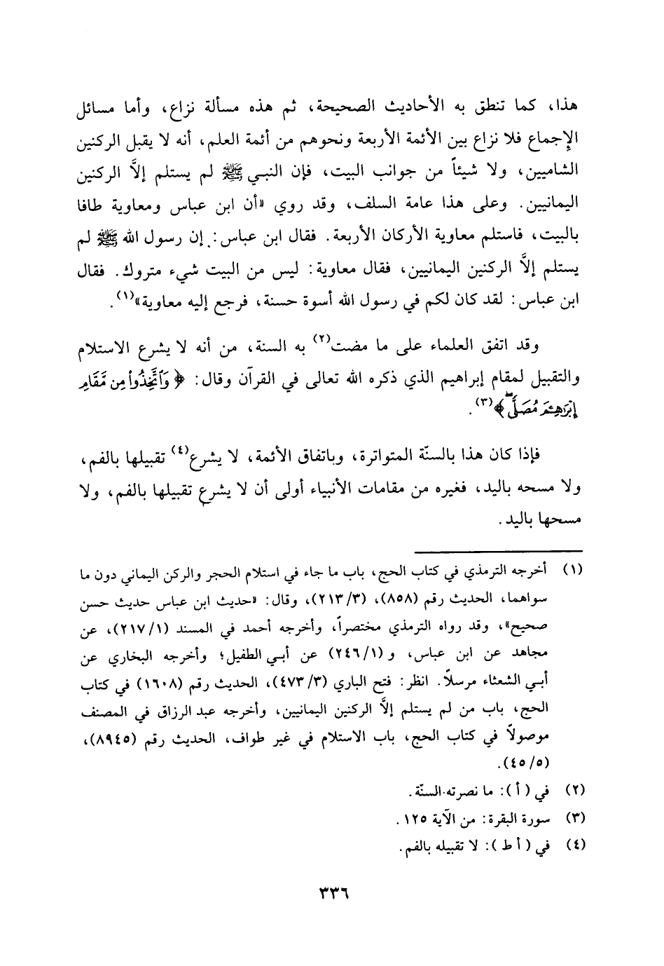 هذا، كما تنطق به الأحاديث الصحيحة، ثم هذه مسألة نزاع، وأما مسائل الإجماع فلا نزاع بين الأئمة الأربعة ونحوهم من أئمة العلم، أنه لا يقبل الركنين الشاميين، ولا شيئا من جوانب البيت، فإن النبي صلى الله عليه وسلم لم يستلم إلا الركنين اليمانيين، وعلى هذا عامة السلف، وقد روي: «أن ابن عباس ومعاوية طافا بالبيت، فاستلم معاوية الأركان الأربعة. فقال ابن عباس: إن رسول الله صلى الله عليه وسلم لم يستلم إلا الركنين اليمانيين، فقال معاوية: ليس من البيت شيء متروك، فقال ابن عباس: لقد كان لكم في رسول الله أسوة حسنة، فرجع إليه معاوية» (¬1) .