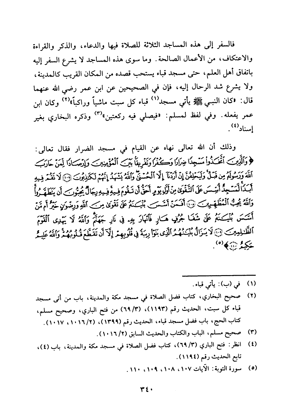 فالسفر إلى هذه المساجد الثلاثة للصلاة فيها والدعاء والذكر والقراءة والاعتكاف، من الأعمال الصالحة. وما سوى هذه المساجد لا يشرع السفر إليه باتفاق أهل العلم، حتى مسجد قباء يستحب قصده من المكان القريب كالمدينة، ولا يشرع شد الرحال إليه، فإن في الصحيحين عن ابن عمر رضي الله عنهما قال: «كان النبي صلى الله عليه وسلم يأتي مسجد (¬1) قباء كل سبت ماشيا وراكبا» (¬2) وكان ابن عمر يفعله. وفي لفظ لمسلم: «فيصلي فيه ركعتين» (¬3) وذكره البخاري بغير إسناد (¬4) .