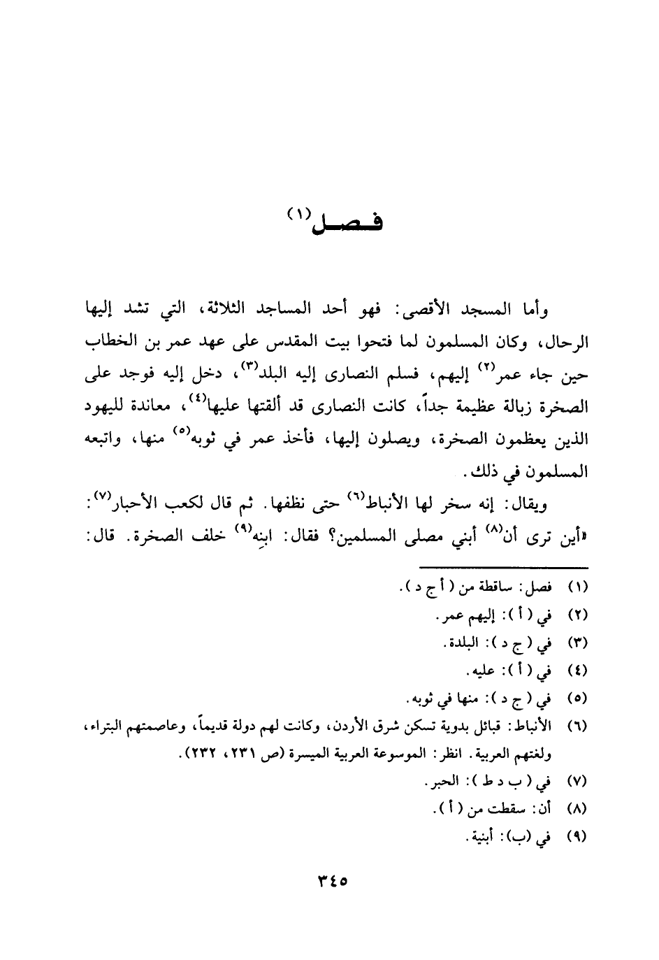 فصل (¬1) وأما المسجد الأقصى: فهو أحد المساجد الثلاثة، التي تشد إليها الرحال، وكان المسلمون لما فتحوا بيت المقدس على عهد عمر بن الخطاب - حين جاء عمر (¬2) إليهم، فسلم النصارى إليه البلد (¬3) - دخل إليه فوجد على الصخرة زبالة عظيمة جدا، كانت النصارى قد ألقتها عليها (¬4) معاندة لليهود الذين يعظمون الصخرة، ويصلون إليها، فأخذ عمر في ثوبه (¬5) منها، واتبعه المسلمون في ذلك.