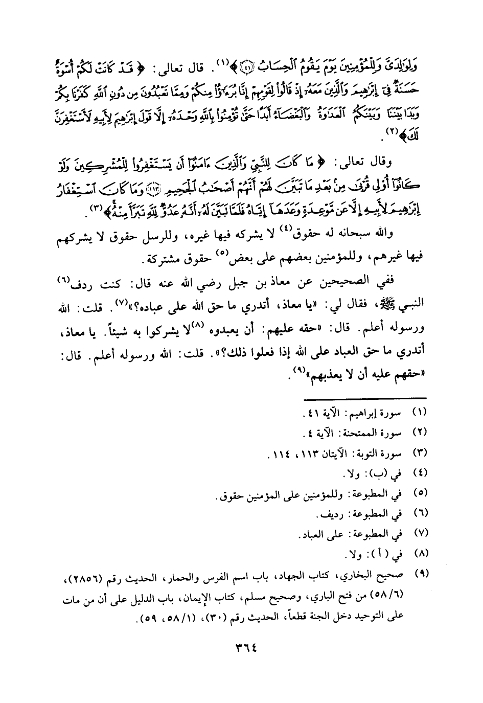 والله سبحانه له حقوق (¬3) لا يشركه فيها غيره، وللرسل حقوق لا يشركهم فيها غيرهم، وللمؤمنين بعضهم على بعض (¬4) حقوق مشتركة؛ ففي الصحيحين عن معاذ بن جبل رضي الله عنه قال: كنت ردف (¬5) النبي صلى الله عليه وسلم، فقال لي: «يا معاذ، أتدري ما حق الله على عباده (¬6) .؟ ". قلت: الله ورسوله أعلم، قال: " حقه عليهم: أن يعبدوه (¬7) لا يشركوا به شيئا. يا معاذ، أتدري ما حق العباد على الله إذا فعلوا ذلك؟ ". قلت: الله ورسوله أعلم، قال: " حقهم عليه أن لا يعذبهم» (¬8) .