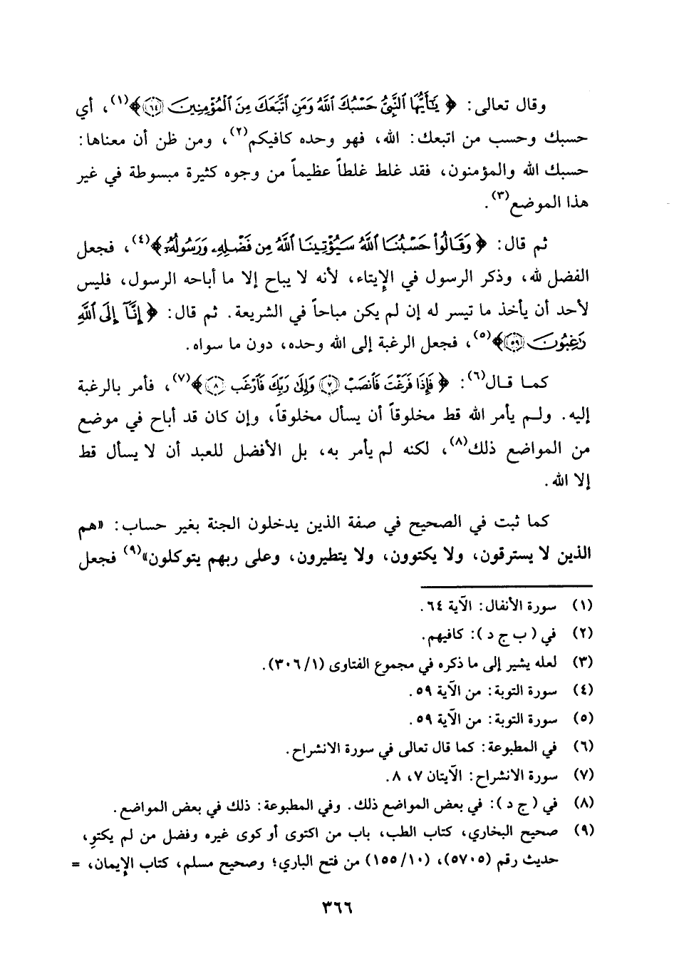 وقال تعالى: {يَا أَيُّهَا النَّبِيُّ حَسْبُكَ اللَّهُ وَمَنِ اتَّبَعَكَ مِنَ الْمُؤْمِنِينَ} [الأنفال: 64] (¬1) أي حسبك وحسب من اتبعك: الله، فهو وحده كافيكم (¬2) ومن ظن أن معناها: حسبك الله والمؤمنون، فقد غلط غلطا عظيما من وجوه كثيرة مبسوطة في غير هذا الموضع (¬3) .