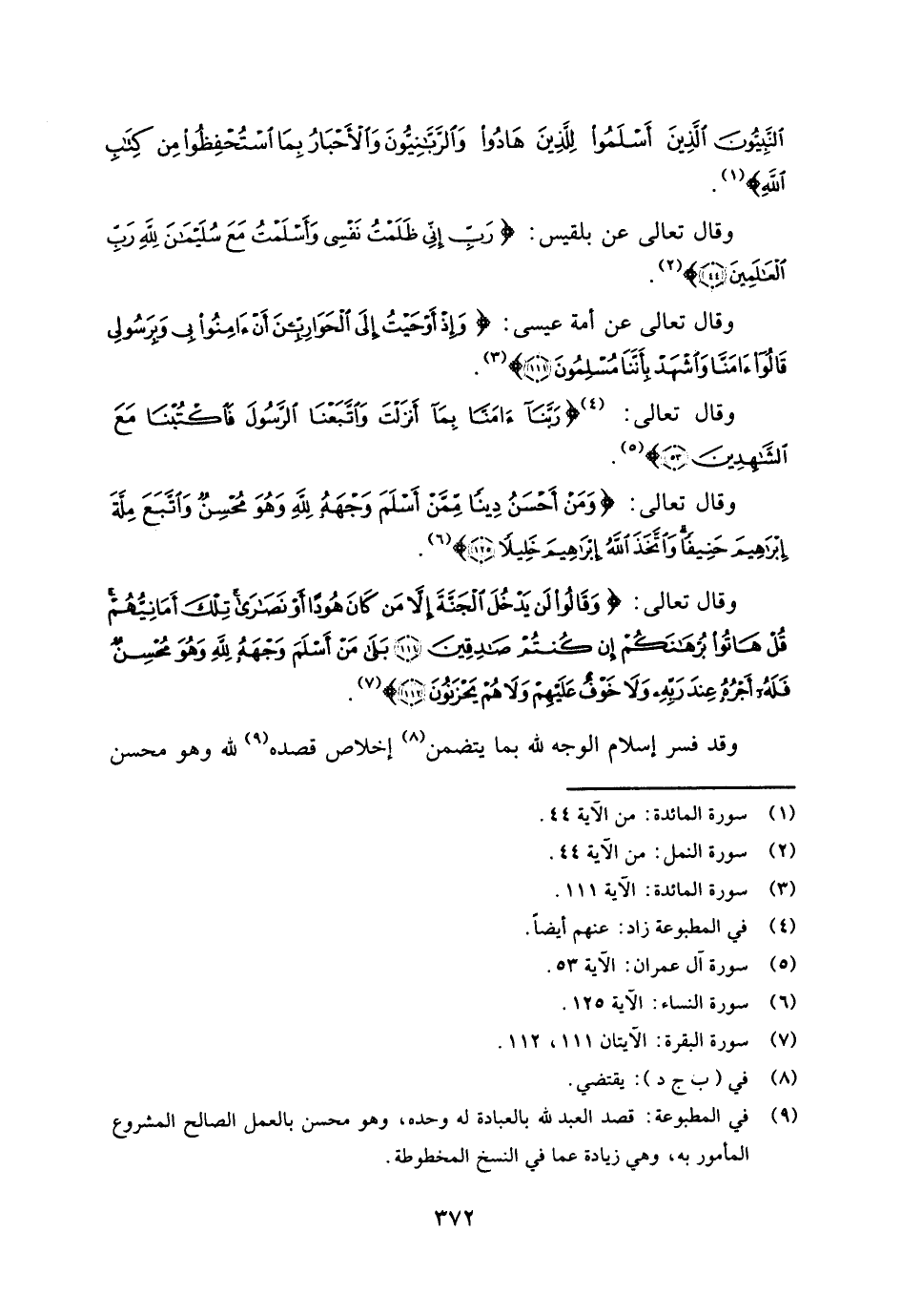 وقال تعالى: {وَقَالُوا لَنْ يَدْخُلَ الْجَنَّةَ إِلَّا مَنْ كَانَ هُودًا أَوْ نَصَارَى تِلْكَ أَمَانِيُّهُمْ قُلْ هَاتُوا بُرْهَانَكُمْ إِنْ كُنْتُمْ صَادِقِينَ - بَلَى مَنْ أَسْلَمَ وَجْهَهُ لِلَّهِ وَهُوَ مُحْسِنٌ فَلَهُ أَجْرُهُ عِنْدَ رَبِّهِ وَلَا خَوْفٌ عَلَيْهِمْ وَلَا هُمْ يَحْزَنُونَ} [البقرة: 111 - 112] (¬7) .