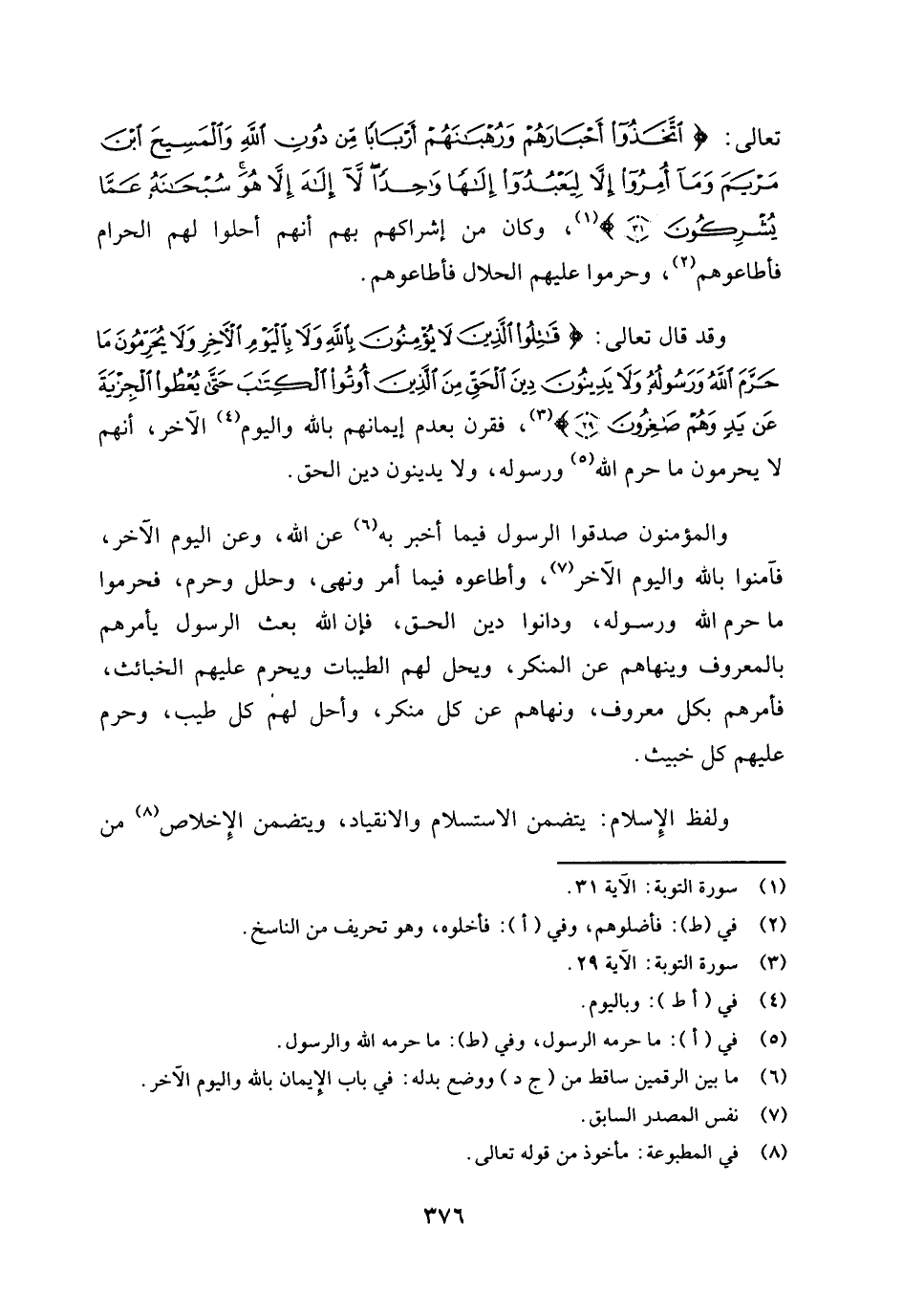 تعالى: {اتَّخَذُوا أَحْبَارَهُمْ وَرُهْبَانَهُمْ أَرْبَابًا مِنْ دُونِ اللَّهِ وَالْمَسِيحَ ابْنَ مَرْيَمَ وَمَا أُمِرُوا إِلَّا لِيَعْبُدُوا إِلَهًا وَاحِدًا لَا إِلَهَ إِلَّا هُوَ سُبْحَانَهُ عَمَّا يُشْرِكُونَ} [التوبة: 31] (¬1) وكان من إشراكهم بهم: أنهم أحلوا لهم الحرام فأطاعوهم (¬2) وحرموا عليهم الحلال فأطاعوهم.