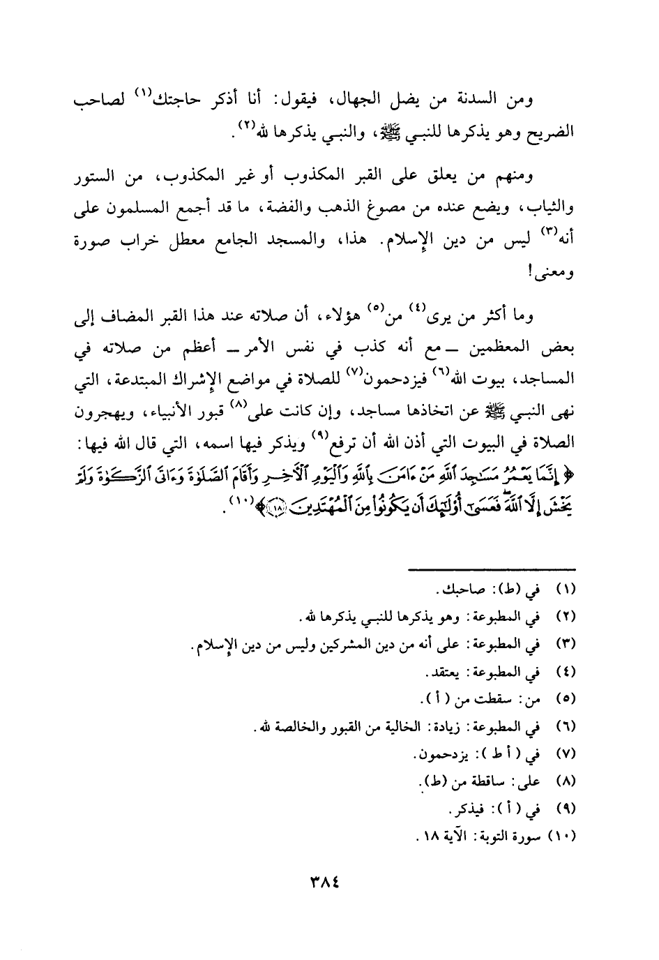 وما أكثر من يرى (¬4) من (¬5) هؤلاء: أن صلاته عند هذا القبر المضاف إلى بعض المعظمين - مع أنه كذب في نفس الأمر - أعظم من صلاته في المساجد بيوت الله (¬6) فيزدحمون (¬7) للصلاة في مواضع الإشراك المبتدعة، التي نهى النبي صلى الله عليه وسلم عن اتخاذها مساجد، وإن كانت على (¬8) قبور الأنبياء، ويهجرون الصلاة في البيوت التي أذن الله أن ترفع (¬9) ويذكر فيها اسمه، التي قال الله فيها: {إِنَّمَا يَعْمُرُ مَسَاجِدَ اللَّهِ مَنْ آمَنَ بِاللَّهِ وَالْيَوْمِ الْآخِرِ وَأَقَامَ الصَّلَاةَ وَآتَى الزَّكَاةَ وَلَمْ يَخْشَ إِلَّا اللَّهَ فَعَسَى أُولَئِكَ أَنْ يَكُونُوا مِنَ الْمُهْتَدِينَ} [التوبة: 18] (¬10) .