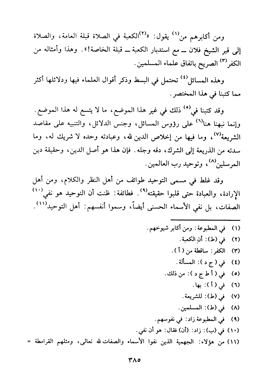 وهذا وأمثاله من الكفر (¬3) الصريح باتفاق علماء المسلمين، وهذه المسائل (¬4) التي تحتمل من البسط وذكر أقوال العلماء فيها ودلائلها أكثر مما كتبنا في هذا المختصر.