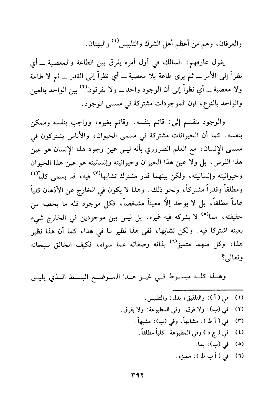 يقول عارفهم: السالك في أول أمره يفرق بين الطاعة والمعصية -أي نظرا إلى الأمر- ثم يرى طاعة بلا معصية- أي نظرا إلى القدر- ثم لا طاعة ولا معصية- أي نظرا إلى أن الوجود واحد -ولا يفرقون (¬2) بين الواحد بالعين والواحد بالنوع، فإن الموجودات مشتركة في مسمى الوجود.