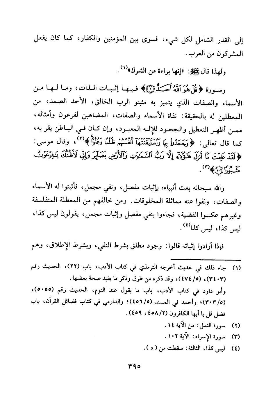 وسورة {قُلْ هُوَ اللَّهُ أَحَدٌ} [الإخلاص: 1] فيها إثبات الذات، وما لها من الأسماء والصفات التي يتميز بها مثبتو الرب الخالق، الأحد الصمد، عن المعطلين له بالحقيقة، نفاة الأسماء والصفات، المضاهين لفرعون وأمثاله ممن أظهر التعطيل والجحود للإله المعبود، وإن كان في الباطن يقر به، كما قال تعالى {وَجَحَدُوا بِهَا وَاسْتَيْقَنَتْهَا أَنْفُسُهُمْ ظُلْمًا وَعُلُوًّا} [النمل: 14] (¬2) وقال موسى {لَقَدْ عَلِمْتَ مَا أَنْزَلَ هَؤُلَاءِ إِلَّا رَبُّ السَّمَاوَاتِ وَالْأَرْضِ بَصَائِرَ وَإِنِّي لَأَظُنُّكَ يَا فِرْعَوْنُ مَثْبُورًا} [الإسراء: 102] (¬3) .