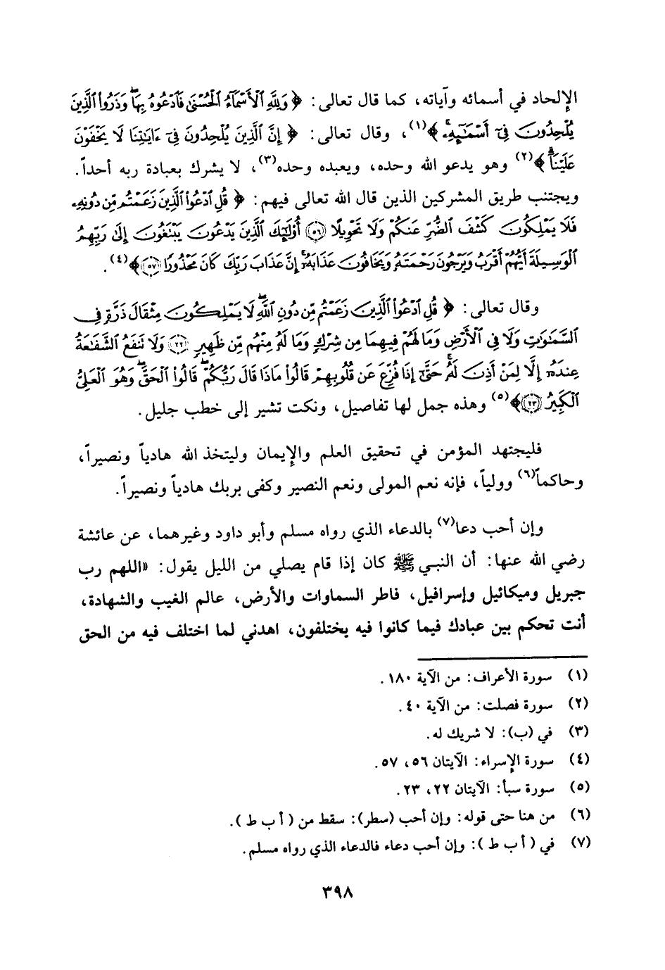 الإلحاد في أسمائه وآياته، قال تعالى {وَلِلَّهِ الْأَسْمَاءُ الْحُسْنَى فَادْعُوهُ بِهَا وَذَرُوا الَّذِينَ يُلْحِدُونَ فِي أَسْمَائِهِ} [الأعراف: 180] (¬1) وقال تعالى {إِنَّ الَّذِينَ يُلْحِدُونَ فِي آيَاتِنَا لَا يَخْفَوْنَ عَلَيْنَا} [فصلت: 40] (¬2) وهو يدعو الله وحده، ويعبده وحده (¬3) لا يشرك بعبادة ربه أحدا، ويجتنب طريق المشركين الذين قال الله تعالى فيهم {قُلِ ادْعُوا الَّذِينَ زَعَمْتُمْ مِنْ دُونِهِ فَلَا يَمْلِكُونَ كَشْفَ الضُّرِّ عَنْكُمْ وَلَا تَحْوِيلًا - أُولَئِكَ الَّذِينَ يَدْعُونَ يَبْتَغُونَ إِلَى رَبِّهِمُ الْوَسِيلَةَ أَيُّهُمْ أَقْرَبُ وَيَرْجُونَ رَحْمَتَهُ وَيَخَافُونَ عَذَابَهُ إِنَّ عَذَابَ رَبِّكَ كَانَ مَحْذُورًا} [الإسراء: 56 - 57] (¬4) .