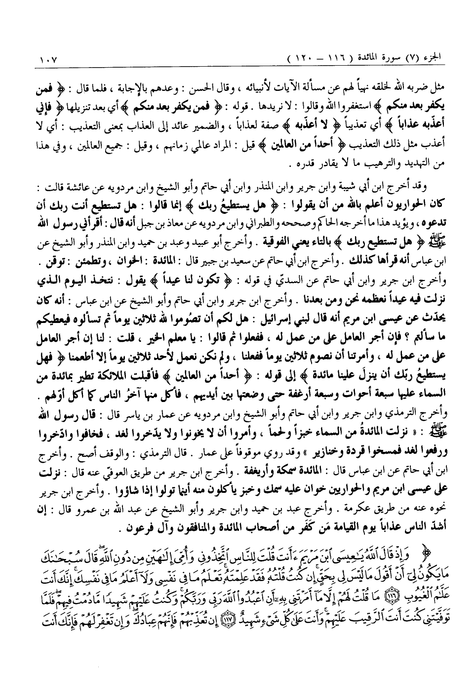 وَإِذْ قالَ اللَّهُ يَا عِيسَى ابْنَ مَرْيَمَ أَأَنْتَ قُلْتَ لِلنَّاسِ اتَّخِذُونِي وَأُمِّي إِلهَيْنِ مِنْ دُونِ اللَّهِ قالَ سُبْحانَكَ مَا يَكُونُ لِي أَنْ أَقُولَ مَا لَيْسَ لِي بِحَقٍّ إِنْ كُنْتُ قُلْتُهُ فَقَدْ عَلِمْتَهُ تَعْلَمُ مَا فِي نَفْسِي وَلا أَعْلَمُ مَا فِي نَفْسِكَ إِنَّكَ أَنْتَ عَلاَّمُ الْغُيُوبِ (116) مَا قُلْتُ لَهُمْ إِلاَّ مَا أَمَرْتَنِي بِهِ أَنِ اعْبُدُوا اللَّهَ رَبِّي وَرَبَّكُمْ وَكُنْتُ عَلَيْهِمْ شَهِيداً مَا دُمْتُ فِيهِمْ فَلَمَّا تَوَفَّيْتَنِي كُنْتَ أَنْتَ الرَّقِيبَ عَلَيْهِمْ وَأَنْتَ عَلى كُلِّ شَيْءٍ شَهِيدٌ (117) إِنْ تُعَذِّبْهُمْ فَإِنَّهُمْ عِبادُكَ وَإِنْ تَغْفِرْ لَهُمْ فَإِنَّكَ أَنْتَ الْعَزِيزُ الْحَكِيمُ (118) قالَ اللَّهُ هَذَا يَوْمُ يَنْفَعُ الصَّادِقِينَ صِدْقُهُمْ لَهُمْ جَنَّاتٌ تَجْرِي مِنْ تَحْتِهَا الْأَنْهارُ خالِدِينَ فِيها أَبَداً رَضِيَ اللَّهُ عَنْهُمْ وَرَضُوا عَنْهُ ذلِكَ الْفَوْزُ الْعَظِيمُ (119) لِلَّهِ مُلْكُ السَّماواتِ وَالْأَرْضِ وَما فِيهِنَّ وَهُوَ عَلى كُلِّ شَيْءٍ قَدِيرٌ (120)
