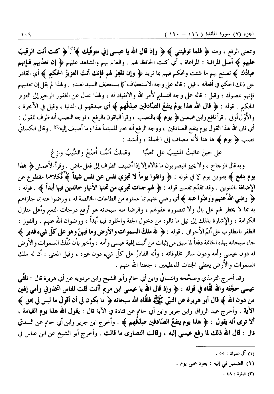 وبمعنى الرفع، ومنه فَلَمَّا تَوَفَّيْتَنِي وإِذْ قالَ اللَّهُ يا عِيسى إِنِّي مُتَوَفِّيكَ «1» . كُنْتَ أَنْتَ الرَّقِيبَ عَلَيْهِمْ أَصْلُ الْمُرَاقَبَةِ: الْمُرَاعَاةُ، أَيْ كُنْتَ الْحَافِظَ لَهُمْ. وَالْعَالِمَ بِهِمْ وَالشَّاهِدَ عَلَيْهِمْ إِنْ تُعَذِّبْهُمْ فَإِنَّهُمْ عِبادُكَ تَصْنَعُ بِهِمْ مَا شِئْتَ وَتَحْكُمُ فِيهِمْ بِمَا تُرِيدُ وَإِنْ تَغْفِرْ لَهُمْ فَإِنَّكَ أَنْتَ الْعَزِيزُ الْحَكِيمُ أَيِ الْقَادِرُ عَلَى ذَلِكَ الْحَكِيمُ فِي أَفْعَالِهِ، قِيلَ: قَالَهُ عَلَى وَجْهِ الِاسْتِعْطَافِ كَمَا يَسْتَعْطِفُ السَّيِّدُ لِعَبْدِهِ. وَلِهَذَا لَمْ يَقُلْ إِنْ تُعَذِّبْهُمْ فَإِنَّهُمْ عَصَوْكَ وَقِيلَ: قَالَهُ عَلَى وَجْهِ التَّسْلِيمِ لِأَمْرِ اللَّهِ وَالِانْقِيَادِ لَهُ، وَلِهَذَا عَدَلَ عَنِ الْغَفُورِ الرَّحِيمِ إِلَى الْعَزِيزِ الْحَكِيمِ. قَوْلُهُ: قالَ اللَّهُ هَذَا يَوْمُ يَنْفَعُ الصَّادِقِينَ صِدْقُهُمْ أَيْ صِدْقُهُمْ فِي الدُّنْيَا، وَقِيلَ فِي الْآخِرَةِ، وَالْأَوَّلُ أَوْلَى. قَرَأَ نَافِعٌ وَابْنُ مُحَيْصِنٍ يَوْمَ بِالنَّصْبِ، وَقَرَأَ الْبَاقُونَ بِالرَّفْعِ، فَوَجْهُ النَّصْبِ أَنَّهُ ظَرْفٌ لِلْقَوْلِ: