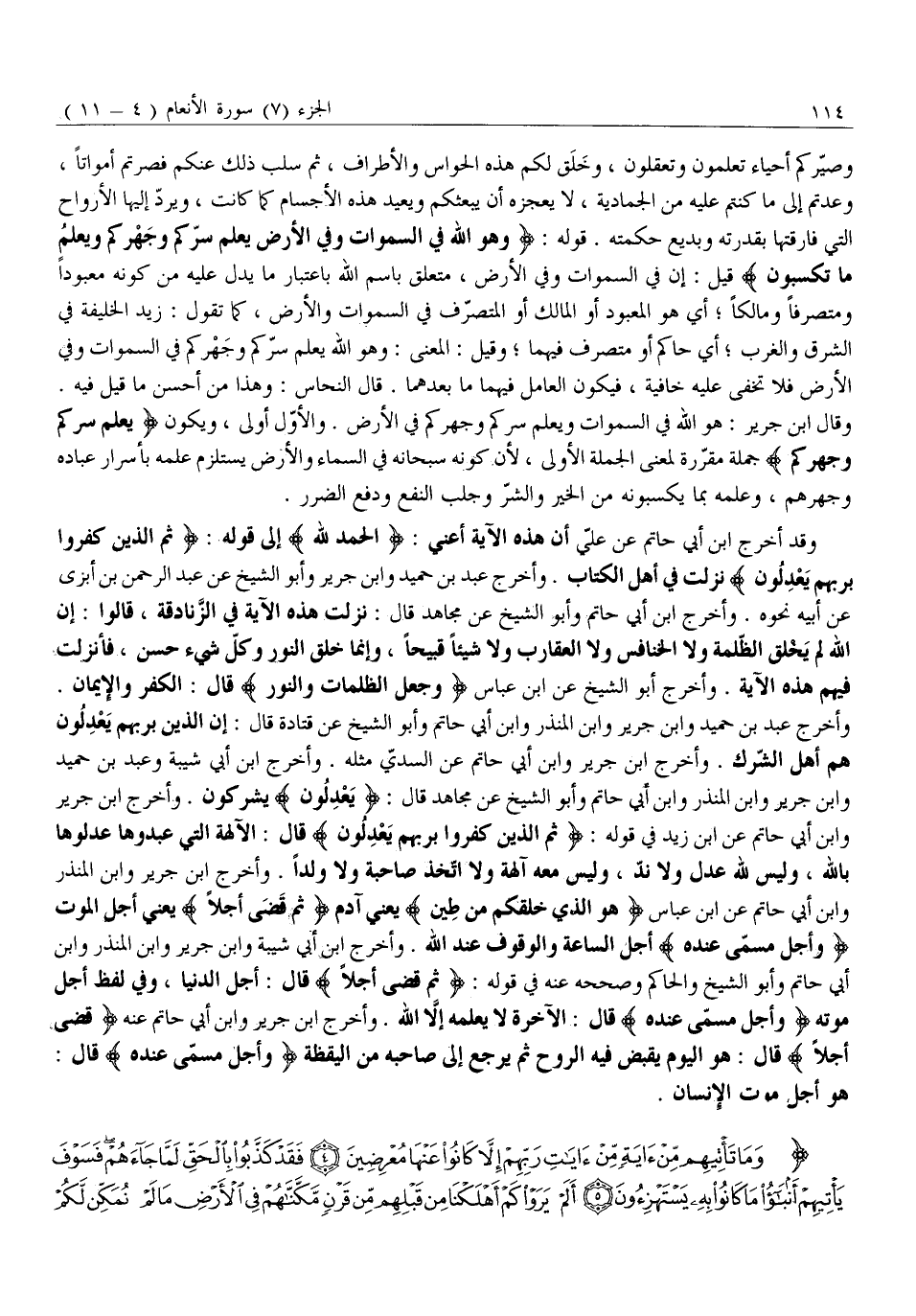 وَأَخْرَجَ عَبْدُ بْنُ حُمَيْدٍ وَابْنُ جَرِيرٍ وَابْنُ المنذر وَابْنُ أَبِي حَاتِمٍ وَأَبُو الشَّيْخِ عَنْ قَتَادَةَ قَالَ: إِنَّ الَّذِينَ بِرَبِّهِمْ يَعْدِلُونَ هُمْ أَهْلُ الشِّرْكِ. وَأَخْرَجَ ابْنُ جَرِيرٍ وَابْنُ أَبِي حَاتِمٍ عَنِ السُّدِّيِّ مِثْلَهُ. وَأَخْرَجَ ابْنُ أَبِي شَيْبَةَ وَعَبْدُ بْنُ حُمَيْدٍ وَابْنُ جَرِيرٍ وَابْنُ الْمُنْذِرِ وَابْنُ أَبِي حَاتِمٍ وَأَبُو الشَّيْخِ عَنْ مُجَاهِدٍ قَالَ: يَعْدِلُونَ يُشْرِكُونَ. وَأَخْرَجَ ابْنُ جَرِيرٍ وَابْنُ أَبِي حَاتِمٍ عَنِ ابن زيد في قوله: ثُمَّ الَّذِينَ كَفَرُوا بِرَبِّهِمْ يَعْدِلُونَ قَالَ: الْآلِهَةُ الَّتِي عَبَدُوهَا عَدَلُوهَا بِاللَّهِ، وَلَيْسَ لِلَّهِ عِدْلٌ وَلَا نِدٌّ، وَلَيْسَ مَعَهُ آلِهَةٌ وَلَا اتَّخَذَ صَاحِبَةً وَلَا وَلَدًا. وَأَخْرَجَ ابْنُ جَرِيرٍ وَابْنُ الْمُنْذِرِ وَابْنُ أَبِي حَاتِمٍ عَنِ ابْنِ عَبَّاسٍ هُوَ الَّذِي خَلَقَكُمْ مِنْ طِينٍ يَعْنِي آدَمَ ثُمَّ قَضى أَجَلًا يَعْنِي أَجَلَ الْمَوْتِ وَأَجَلٌ مُسَمًّى عِنْدَهُ أَجَلُ السَّاعَةِ وَالْوُقُوفُ عِنْدَ اللَّهِ. وَأَخْرَجَ ابْنُ أَبِي شَيْبَةَ وَابْنُ جَرِيرٍ وَابْنُ الْمُنْذِرِ وَابْنُ أَبِي حَاتِمٍ وَأَبُو الشَّيْخِ وَالْحَاكِمُ وَصَحَّحَهُ عَنْهُ فِي قَوْلِهِ: ثُمَّ قَضى أَجَلًا قَالَ: أَجَلُ الدُّنْيَا، وَفِي لَفْظٍ أَجَلُ مَوْتِهِ وَأَجَلٌ مُسَمًّى عِنْدَهُ قَالَ: الْآخِرَةُ لَا يَعْلَمُهُ إِلَّا اللَّهُ. وَأَخْرَجَ ابْنُ جَرِيرٍ وَابْنُ أَبِي حَاتِمٍ عَنْهُ قَضى أَجَلًا قَالَ: هُوَ الْيَوْمُ يُقْبَضُ فِيهِ الرُّوحُ ثُمَّ يَرْجِعُ إِلَى صَاحِبِهِ مِنَ الْيَقَظَةِ وَأَجَلٌ مُسَمًّى عِنْدَهُ قَالَ: