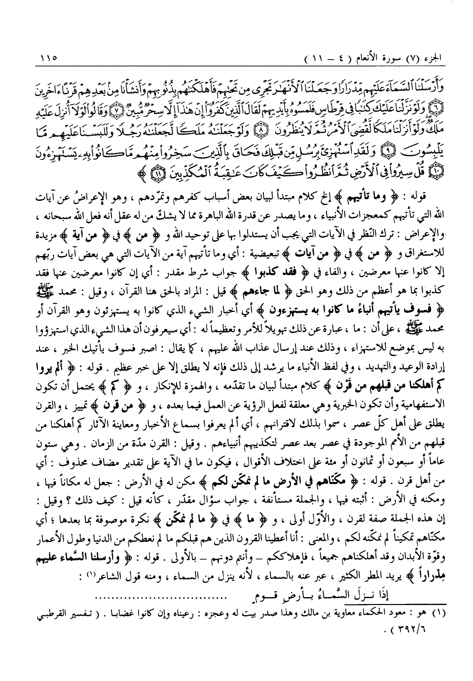 إِنَّ هَذِهِ الْجُمْلَةَ صِفَةٌ لِقَرْنٍ، وَالْأَوَّلُ أَوْلَى، وما فِي مَا لَمْ نُمَكِّنْ نَكِرَةٌ مَوْصُوفَةٌ بِمَا بَعْدَهَا أَيْ مَكَّنَّاهُمْ تَمْكِينًا لَمْ نُمَكِّنْهُ لَكُمْ، وَالْمَعْنَى: أَنَّا أَعْطَيْنَا الْقُرُونَ الَّذِينَ هُمْ قَبْلَكُمْ مَا لَمْ نُعْطِكُمْ مِنَ الدُّنْيَا وَطُولِ الْأَعْمَارِ وَقُوَّةِ الْأَبْدَانِ وَقَدْ أَهْلَكْنَاهُمْ جَمِيعًا، فَإِهْلَاكُكُمْ- وَأَنْتُمْ دُونَهُمْ- بِالْأَوْلَى. قَوْلُهُ: وَأَرْسَلْنَا السَّماءَ عَلَيْهِمْ مِدْراراً يُرِيدُ الْمَطَرَ الْكَثِيرَ، عَبَّرَ عَنْهُ بِالسَّمَاءِ، لِأَنَّهُ يَنْزِلُ مِنَ السَّمَاءِ، وَمِنْهُ قَوْلُ الشَّاعِرِ «1» :