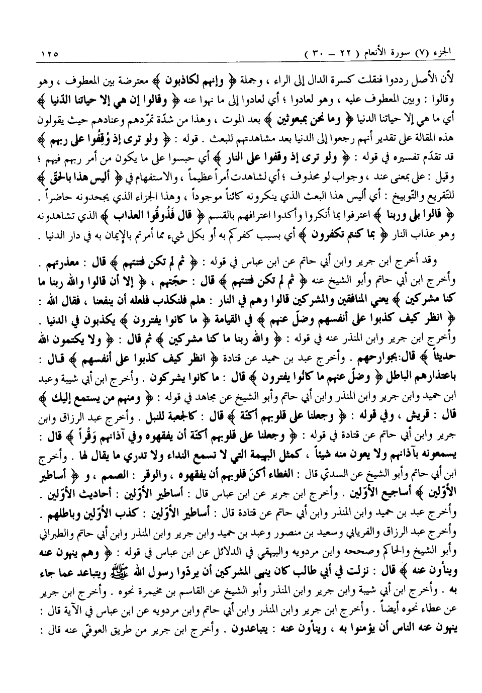 بِاعْتِذَارِهِمُ الْبَاطِلِ وَضَلَّ عَنْهُمْ مَا كانُوا يَفْتَرُونَ قَالَ: مَا كَانُوا يُشْرِكُونَ. وَأَخْرَجَ ابْنُ أَبِي شيبة وعبد ابن حُمَيْدٍ وَابْنُ جَرِيرٍ وَابْنُ الْمُنْذِرِ وَابْنُ أَبِي حَاتِمٍ وَأَبُو الشَّيْخِ عَنْ مُجَاهِدٍ فِي قَوْلِهِ: وَمِنْهُمْ مَنْ يَسْتَمِعُ إِلَيْكَ قَالَ: قُرَيْشٌ، وَفِي قَوْلِهِ: وَجَعَلْنا عَلى قُلُوبِهِمْ أَكِنَّةً قَالَ: كَالْجُعْبَةِ لِلنَّبْلِ. وَأَخْرَجَ عَبْدُ الرَّزَّاقِ وَابْنُ جَرِيرٍ وَابْنُ أَبِي حَاتِمٍ عَنْ قَتَادَةَ فِي قَوْلِهِ: وَجَعَلْنا عَلى قُلُوبِهِمْ أَكِنَّةً أَنْ يَفْقَهُوهُ وَفِي آذانِهِمْ وَقْراً قَالَ: