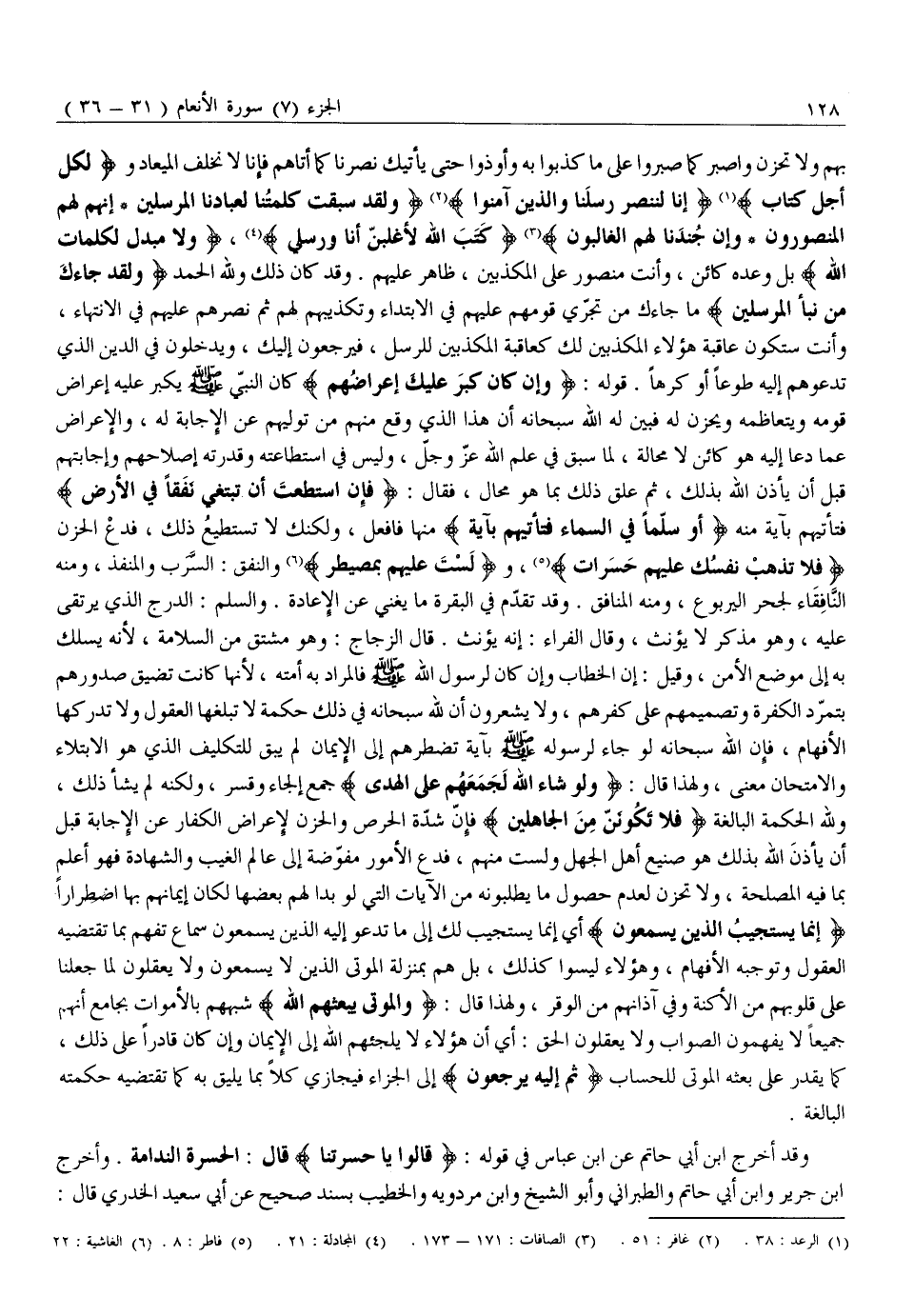 بِهِمْ وَلَا تَحْزَنْ وَاصْبِرْ كَمَا صَبَرُوا عَلَى مَا كُذِّبُوا بِهِ وَأُوذُوا حَتَّى يَأْتِيَكَ نَصْرُنَا كما أتاهم فإنا لا نخلف الميعاد ولِكُلِّ أَجَلٍ كِتابٌ «1» إِنَّا لَنَنْصُرُ رُسُلَنا وَالَّذِينَ آمَنُوا «2» وَلَقَدْ سَبَقَتْ كَلِمَتُنا لِعِبادِنَا الْمُرْسَلِينَ- إِنَّهُمْ لَهُمُ الْمَنْصُورُونَ- وَإِنَّ جُنْدَنا لَهُمُ الْغالِبُونَ «3» كَتَبَ اللَّهُ لَأَغْلِبَنَّ أَنَا وَرُسُلِي «4» ، وَلا مُبَدِّلَ لِكَلِماتِ اللَّهِ بَلْ وَعْدُهُ كَائِنٌ، وَأَنْتَ مَنْصُورٌ عَلَى الْمُكَذِّبِينَ، ظَاهِرٌ عَلَيْهِمْ. وَقَدْ كَانَ ذَلِكَ وَلِلَّهِ الْحَمْدُ وَلَقَدْ جاءَكَ مِنْ نَبَإِ الْمُرْسَلِينَ مَا جَاءَكَ مِنْ تَجَرِّي قَوْمِهِمْ عَلَيْهِمْ فِي الِابْتِدَاءِ وَتَكْذِيبِهِمْ لَهُمْ ثُمَّ نَصَرَهُمْ عَلَيْهِمْ فِي الِانْتِهَاءِ، وَأَنْتَ سَتَكُونُ عَاقِبَةُ هَؤُلَاءِ الْمُكَذِّبِينَ لَكَ كَعَاقِبَةِ الْمُكَذِّبِينَ لِلرُّسُلِ، فَيَرْجِعُونَ إِلَيْكَ، وَيَدْخُلُونَ فِي الدِّينِ الَّذِي تَدْعُوهُمْ إِلَيْهِ طَوْعًا أَوْ كَرْهًا. قَوْلُهُ: وَإِنْ كانَ كَبُرَ عَلَيْكَ إِعْراضُهُمْ كان النّبي صلّى الله عليه وَسَلَّمَ يَكْبُرُ عَلَيْهِ إِعْرَاضُ قَوْمِهِ وَيَتَعَاظَمُهُ وَيَحْزَنُ لَهُ فَبَيَّنَ لَهُ اللَّهُ سُبْحَانَهُ أَنَّ هَذَا الَّذِي وَقَعَ مِنْهُمْ مِنْ تَوَلِّيهِمْ عَنِ الْإِجَابَةِ لَهُ، وَالْإِعْرَاضِ عَمَّا دَعَا إِلَيْهِ هُوَ كَائِنٌ لَا مَحَالَةَ، لِمَا سَبَقَ فِي عِلْمِ اللَّهِ عَزَّ وَجَلَّ، وَلَيْسَ فِي اسْتِطَاعَتِهِ وَقُدْرَتِهِ إِصْلَاحُهُمْ وَإِجَابَتُهُمْ قَبْلَ أَنْ يَأْذَنَ اللَّهُ بِذَلِكَ، ثُمَّ عَلَّقَ ذَلِكَ بِمَا هُوَ مُحَالٌ، فَقَالَ: فَإِنِ اسْتَطَعْتَ أَنْ تَبْتَغِيَ نَفَقاً فِي الْأَرْضِ فَتَأْتِيَهُمْ بِآيَةٍ مِنْهُ أَوْ سُلَّماً فِي السَّماءِ فَتَأْتِيَهُمْ بِآيَةٍ مِنْهَا فَافْعَلْ، وَلَكِنَّكَ لَا تَسْتَطِيعُ ذَلِكَ، فدع الحزن فَلا تَذْهَبْ نَفْسُكَ عَلَيْهِمْ حَسَراتٍ «5» ، ولَسْتَ عَلَيْهِمْ بِمُصَيْطِرٍ «6» وَالنَّفَقُ: السَّرَبُ وَالْمَنْفَذُ، وَمِنْهُ النَّافِقَاءُ لِجُحْرِ الْيَرْبُوعِ، وَمِنْهُ الْمُنَافِقُ. وَقَدْ تَقَدَّمَ فِي الْبَقَرَةِ مَا يُغْنِي عَنِ الْإِعَادَةِ. وَالسُّلَّمُ: الدَّرَجُ الَّذِي يُرْتَقَى عَلَيْهِ، وَهُوَ مُذَكَّرٌ لَا يُؤَنَّثُ، وَقَالَ الْفَرَّاءُ: إِنَّهُ يُؤَنَّثُ. قَالَ الزَّجَّاجُ: وَهُوَ مُشْتَقٌّ مِنَ السَّلَامَةِ، لِأَنَّهُ يُسْلَكُ بِهِ إِلَى مَوْضِعِ الْأَمْنِ، وَقِيلَ: إِنَّ الْخِطَابَ وَإِنْ كَانَ لِرَسُولِ اللَّهِ صَلَّى اللَّهُ عَلَيْهِ وَسَلَّمَ فَالْمُرَادُ بِهِ أُمَّتُهُ، لِأَنَّهَا كَانَتْ تَضِيقُ صُدُورُهُمْ بِتَمَرُّدِ الْكَفَرَةِ وَتَصْمِيمِهِمْ عَلَى كُفْرِهِمْ، وَلَا يَشْعُرُونَ أَنَّ لِلَّهِ سُبْحَانَهُ فِي ذَلِكَ حِكْمَةً لَا تَبْلُغُهَا الْعُقُولُ وَلَا تُدْرِكُهَا الْأَفْهَامُ، فَإِنَّ اللَّهَ سُبْحَانَهُ لَوْ جَاءَ لِرَسُولِهِ صَلَّى اللَّهُ عليه وَسَلَّمَ بِآيَةٍ تَضْطَرُّهُمْ إِلَى الْإِيمَانِ لَمْ يَبْقَ لِلتَّكْلِيفِ الَّذِي هُوَ الِابْتِلَاءُ وَالِامْتِحَانُ مَعْنًى، وَلِهَذَا قَالَ: وَلَوْ شاءَ اللَّهُ لَجَمَعَهُمْ عَلَى الْهُدى جَمْعُ إِلْجَاءٍ وَقَسْرٍ، وَلَكِنَّهُ لَمْ يَشَأْ ذَلِكَ، وَلِلَّهِ الْحِكْمَةُ الْبَالِغَةُ فَلا تَكُونَنَّ مِنَ الْجاهِلِينَ فَإِنَّ شِدَّةَ الْحِرْصِ وَالْحُزْنَ لِإِعْرَاضِ الْكُفَّارِ عَنِ الْإِجَابَةِ قَبْلَ أَنْ يَأْذَنَ اللَّهُ بِذَلِكَ هُوَ صَنِيعُ أَهْلِ الْجَهْلِ وَلَسْتَ مِنْهُمْ، فَدَعِ الْأُمُورَ مُفَوَّضَةً إِلَى عَالِمِ الْغَيْبِ وَالشَّهَادَةِ فَهُوَ أَعْلَمُ بِمَا فِيهِ الْمَصْلَحَةُ، وَلَا تَحْز