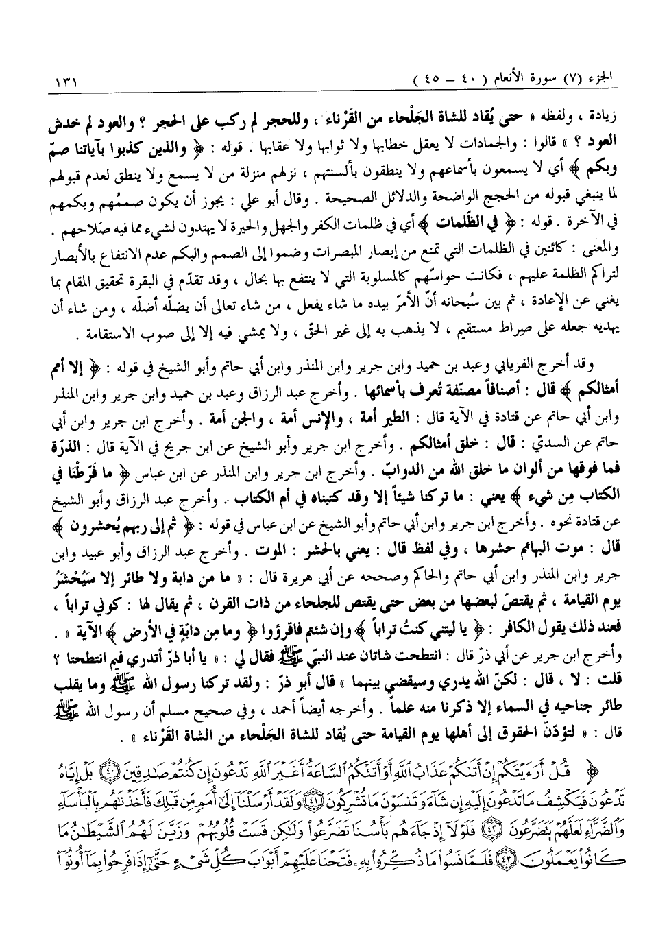 قُلْتُ: لَا، قَالَ: لَكِنَّ اللَّهَ يَدْرِي وَسَيَقْضِي بَيْنَهُمَا» قَالَ أَبُو ذَرٍّ: وَلَقَدْ تركنا رَسُولُ اللَّهِ صَلَّى اللَّهُ عَلَيْهِ وَسَلَّمَ وَمَا يَقْلِبُ طَائِرٌ جَنَاحَيْهِ فِي السَّمَاءِ إِلَّا ذَكَرْنَا مِنْهُ عِلْمًا. وَأَخْرَجَهُ أَيْضًا أَحْمَدُ، وَفِي صَحِيحِ مُسْلِمٍ أَنَّ رَسُولَ اللَّهِ صَلَّى اللَّهُ عَلَيْهِ وَسَلَّمَ قَالَ: «لِتُؤَدُّنَّ الْحُقُوقَ إِلَى أَهْلِهَا يَوْمَ الْقِيَامَةِ حَتَّى يُقَادَ لِلشَّاةِ الْجَلْحَاءِ مِنَ الشَّاةِ القرناء» .