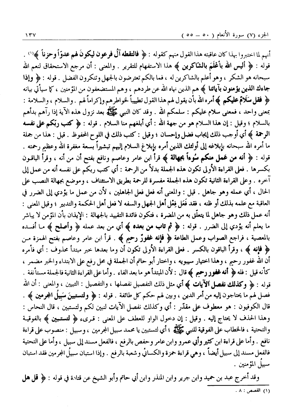 أَنَّهُ عَمِلَ ذَلِكَ وَهُوَ جَاهِلٌ لِمَا يَتَعَلَّقُ بِهِ مِنَ الْمَضَرَّةِ، فَتَكُونُ فَائِدَةُ التَّقْيِيدِ بِالْجَهَالَةِ: الْإِيذَانَ بِأَنَّ الْمُؤْمِنَ لَا يُبَاشِرُ مَا يَعْلَمُ أَنَّهُ يُؤَدِّي إِلَى الضَّرَرِ. قَوْلُهُ: ثُمَّ تابَ مِنْ بَعْدِهِ أَيْ مِنْ بَعْدِ عَمَلِهِ وَأَصْلَحَ مَا أَفْسَدَهُ بِالْمَعْصِيَةِ، فَرَاجَعَ الصَّوَابَ وَعَمِلَ الطَّاعَةَ فَأَنَّهُ غَفُورٌ رَحِيمٌ. قَرَأَ ابْنُ عَامِرٍ وَعَاصِمٌ بِفَتْحِ الْهَمْزَةِ مِنْ فَأَنَّهُ، وَقَرَأَ الْبَاقُونَ بِالْكَسْرِ. فَعَلَى الْقِرَاءَةِ الْأُولَى تَكُونُ أَنَّ وَمَا بَعْدَهَا خَبَرَ مُبْتَدَأٍ مَحْذُوفٍ: أَيْ فَأَمَرَهُ أَنَّ اللَّهَ غَفُورٌ رَحِيمٌ، وَهَذَا اخْتِيَارُ سِيبَوَيْهِ، وَاخْتَارَ أَبُو حَاتِمٍ أَنَّ الْجُمْلَةَ فِي مَحَلِّ رَفْعٍ عَلَى الِابْتِدَاءِ وَالْخَبَرُ مُضْمَرٌ، كَأَنَّهُ قِيلَ: فَلَهُ فَأَنَّهُ غَفُورٌ رَحِيمٌ قَالَ: لِأَنَّ الْمُبْتَدَأَ هُوَ مَا بَعْدَ الْفَاءِ. وَأَمَّا عَلَى الْقِرَاءَةِ الثَّانِيَةِ فَالْجُمْلَةُ مُسْتَأْنَفَةٌ.