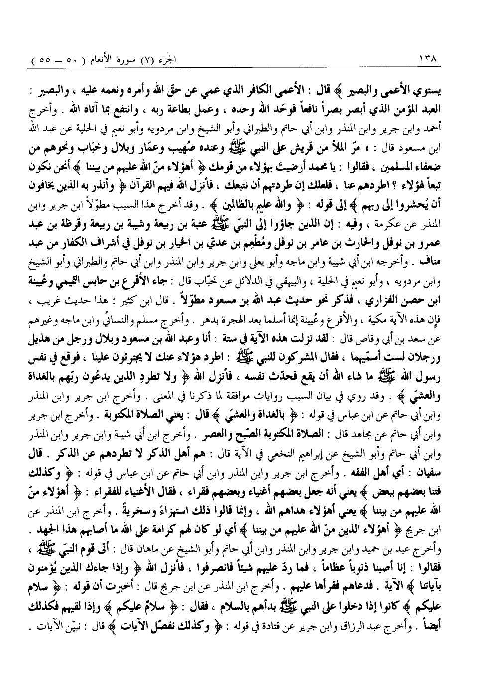الْعَبْدُ الْمُؤْمِنُ الَّذِي أَبْصَرَ بَصَرًا نَافِعًا فَوَحَّدَ اللَّهَ وَحْدَهُ، وَعَمِلَ بِطَاعَةِ رَبِّهِ، وَانْتَفَعَ بِمَا أَتَاهُ اللَّهُ. وَأَخْرَجَ أَحْمَدُ وَابْنُ جَرِيرٍ وَابْنُ الْمُنْذِرِ وَابْنُ أَبِي حَاتِمٍ وَالطَّبَرَانِيُّ وَأَبُو الشَّيْخِ وَابْنُ مَرْدَوَيْهِ وَأَبُو نُعَيْمٍ فِي الْحِلْيَةِ عَنْ عبد الله ابن مَسْعُودٍ قَالَ: «مَرَّ الْمَلَأُ مِنْ قُرَيْشٍ عَلَى النبي صلّى الله عليه وَسَلَّمَ وَعِنْدَهُ صُهَيْبٌ وَعَمَّارٌ وَبِلَالٌ وَخَبَّابٌ وَنَحْوُهُمْ مِنْ ضُعَفَاءِ الْمُسْلِمِينَ، فَقَالُوا: يَا مُحَمَّدُ أَرَضِيتَ بِهَؤُلَاءِ مِنْ قَوْمِكَ أَهؤُلاءِ مَنَّ اللَّهُ عَلَيْهِمْ مِنْ بَيْنِنا أَنَحْنُ نَكُونُ تَبَعًا لِهَؤُلَاءِ؟ اطْرُدْهُمْ عَنَّا، فَلَعَلَّكَ إِنْ طَرَدْتَهُمْ أَنْ نَتَّبِعَكَ، فَأَنْزَلَ اللَّهُ فِيهِمُ الْقُرْآنَ وَأَنْذِرْ بِهِ الَّذِينَ يَخافُونَ أَنْ يُحْشَرُوا إِلى رَبِّهِمْ إِلَى قَوْلِهِ: وَاللَّهُ أَعْلَمُ بِالظَّالِمِينَ. وَقَدْ أَخْرَجَ هَذَا السَّبَبَ مُطَوَّلًا ابْنُ جَرِيرٍ وَابْنُ الْمُنْذِرِ عَنْ عِكْرِمَةَ، وَفِيهِ: أَنَّ الَّذِينَ جَاءُوا إِلَى النَّبِيِّ صَلَّى اللَّهُ عليه وَسَلَّمَ عُتْبَةُ بْنُ رَبِيعَةَ وَشَيْبَةُ بْنُ رَبِيعَةَ وَقَرَظَةُ بْنُ عَبْدِ عَمْرِو بْنِ نَوْفَلٍ وَالْحَارِثُ بْنُ عَامِرِ بْنِ نَوْفَلٍ وَمُطْعِمُ بْنُ عَدِيِّ بْنِ الْخِيَارِ بْنِ نَوْفَلٍ فِي أَشْرَافِ الْكُفَّارِ مِنْ عَبْدِ مَنَافٍ. وَأَخْرَجَهُ ابْنُ أَبِي شَيْبَةَ وَابْنُ مَاجَهْ وَأَبُو يَعْلَى وَابْنُ جَرِيرٍ وَابْنُ الْمُنْذِرِ وَابْنُ أَبِي حَاتِمٍ وَالطَّبَرَانِيُّ وَأَبُو الشَّيْخِ وَابْنُ مَرْدَوَيْهِ، وَأَبُو نُعَيْمٍ فِي الْحِلْيَةِ، وَالْبَيْهَقِيُّ فِي الدَّلَائِلِ عَنْ خَبَّابٍ قَالَ: جَاءَ الْأَقْرَعُ بن حابس التميمي وعيينة ابن حِصْنٍ الْفَزَارِيُّ، فَذَكَرَ نَحْوَ حَدِيثِ عَبْدِ اللَّهِ بْنِ مَسْعُودٍ مُطَوَّلًا. قَالَ ابْنُ كَثِيرٍ: هَذَا حَدِيثٌ غَرِيبٌ، فَإِنَّ هَذِهِ الْآيَةَ مَكِّيَّةٌ، وَالْأَقْرَعُ وَعُيَيْنَةُ إِنَّمَا أَسْلَمَا بَعْدَ الْهِجْرَةِ بِدَهْرٍ. وَأَخْرَجَ مُسْلِمٌ وَالنَّسَائِيُّ وَابْنُ مَاجَهْ وَغَيْرُهُمْ عَنْ سَعْدِ بْنِ أَبِي وَقَّاصٍ قَالَ: لَقَدْ نَزَلَتْ هَذِهِ الْآيَةُ فِي سِتَّةٍ: أَنَا وَعَبْدُ اللَّهِ بْنُ مَسْعُودٍ وَبِلَالٌ وَرَجُلٌ مِنْ هُذَيْلٍ وَرَجُلَانِ لَسْتُ أُسَمِّيهُمَا، فَقَالَ الْمُشْرِكُونَ لِلنَّبِيِّ صَلَّى اللَّهُ عَلَيْهِ وسلّم: اطرد هؤلاء عنك لا يجترءون عَلَيْنَا، فَوَقَعَ فِي نَفْسِ رَسُولِ اللَّهِ صَلَّى اللَّهُ عَلَيْهِ وَسَلَّمَ مَا شَاءَ اللَّهُ أَنْ يَقَعَ فَحَدَّثَ نَفْسَهُ، فَأَنْزَلَ اللَّهُ وَلا تَطْرُدِ الَّذِينَ يَدْعُونَ رَبَّهُمْ بِالْغَداةِ وَالْعَشِيِّ. وَقَدْ رُوِيَ فِي بَيَانِ السَّبَبِ رِوَايَاتٌ مُوَافِقَةٌ لِمَا ذَكَرْنَا فِي الْمَعْنَى. وَأَخْرَجَ ابْنُ جَرِيرٍ وَابْنُ الْمُنْذِرِ وَابْنُ أَبِي حَاتِمٍ عَنِ ابْنِ عَبَّاسٍ فِي قَوْلِهِ: بِالْغَداةِ وَالْعَشِيِّ قَالَ: يَعْنِي الصَّلَاةَ الْمَكْتُوبَةَ. وَأَخْرَجَ ابْنُ جَرِيرٍ وَابْنُ أَبِي حَاتِمٍ عَنْ مُجَاهِدٍ قَالَ: الصَّلَاةُ الْمَكْتُوبَةُ الصُّبْحُ وَالْعَصْرُ. وَأَخْرَجَ ابْنُ أَبِي شَيْبَةَ وَابْنُ جَرِيرٍ وَابْنُ الْمُنْذِرِ وَابْنُ أَبِي حَاتِمٍ وَأَبُو الشَّيْخِ عَنْ إِبْرَاهِيمَ النَّخَعِيِّ فِي الْآيَةِ قَالَ: هُمْ أَهْلُ الذِّكْرِ لَا تَطْرُدْهُمْ عَنِ الذِّكْرِ. قَالَ سُفْيَانُ: أَيْ أَهْلِ الْفِقْهِ. وَأَخْرَجَ ابْنُ جَرِيرٍ وَابْنُ الْمُنْذِرِ وَابْنُ أَبِي حَاتِمٍ عَنِ ابْنِ عَبَّاسٍ فِي قَوْلِهِ: وَكَذلِكَ فَتَنَّا بَعْضَهُمْ بِبَعْضٍ يَعْنِي