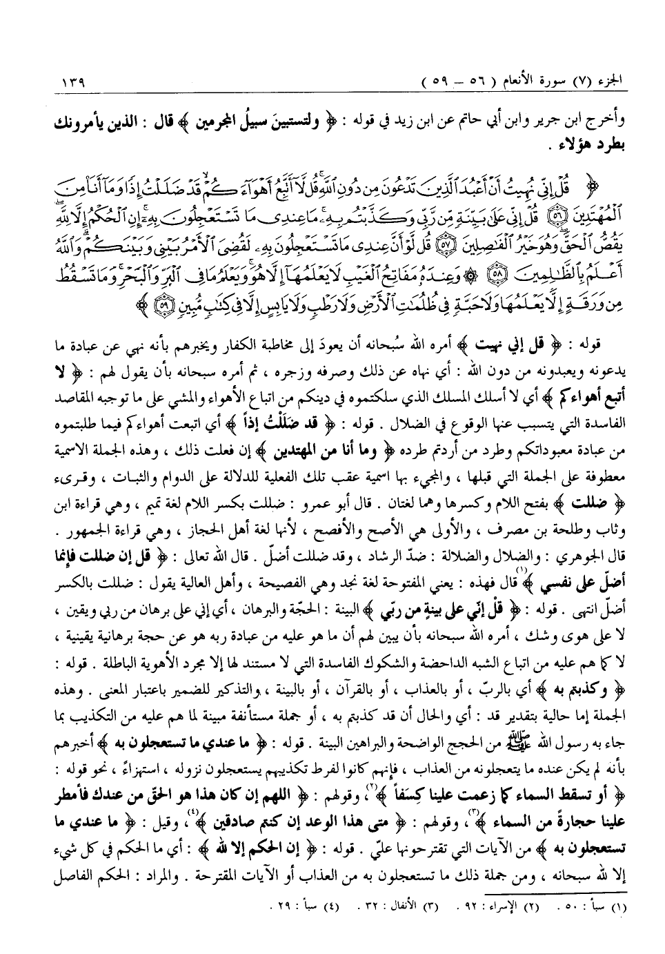وَأَخْرَجَ ابْنُ جَرِيرٍ وَابْنُ أَبِي حَاتِمٍ عَنِ ابْنِ زَيْدٍ فِي قَوْلِهِ: وَلِتَسْتَبِينَ سَبِيلُ الْمُجْرِمِينَ قال: الذين يأمرونك بطرد هؤلاء.