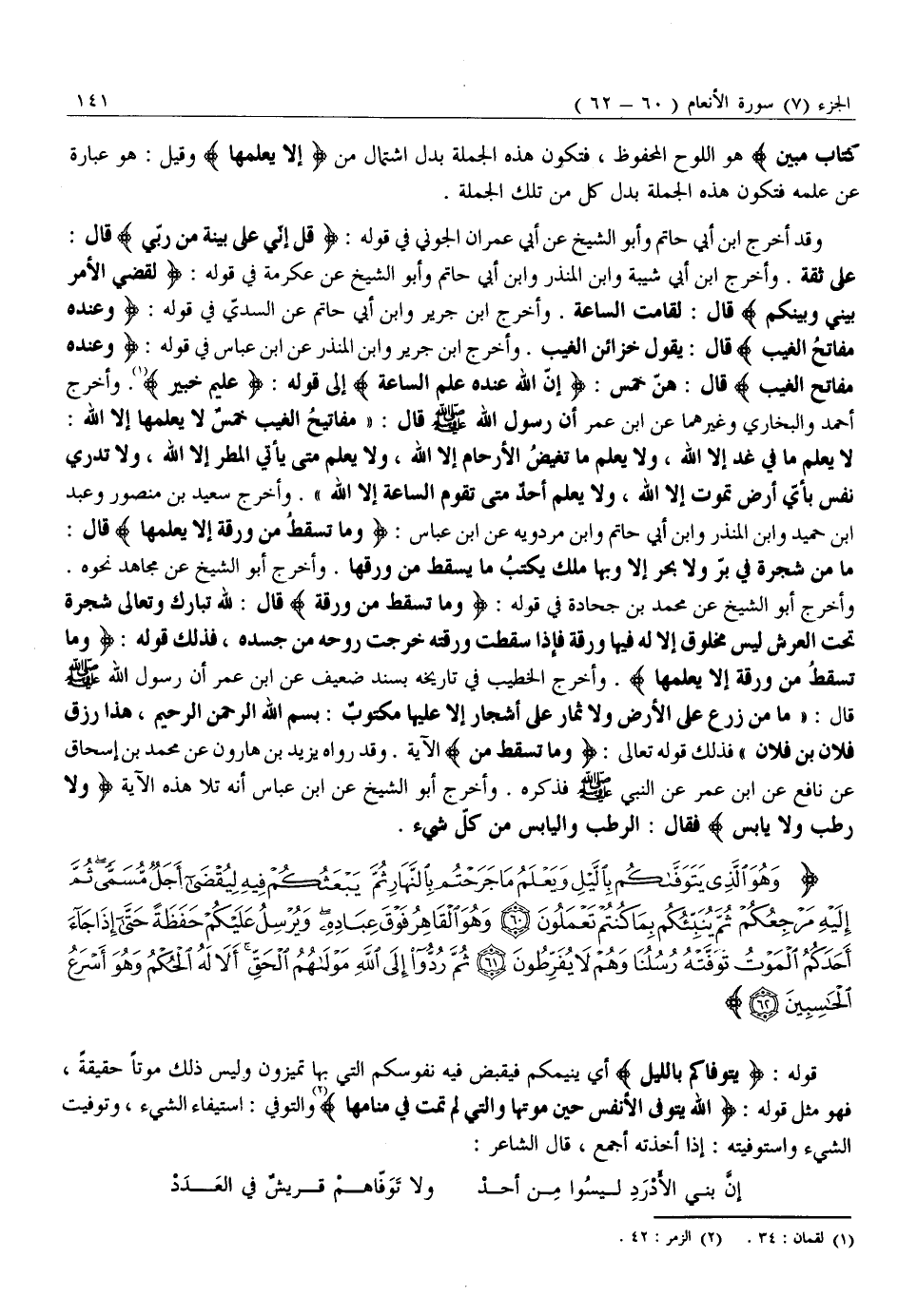 وَهُوَ الَّذِي يَتَوَفَّاكُمْ بِاللَّيْلِ وَيَعْلَمُ مَا جَرَحْتُمْ بِالنَّهارِ ثُمَّ يَبْعَثُكُمْ فِيهِ لِيُقْضى أَجَلٌ مُسَمًّى ثُمَّ إِلَيْهِ مَرْجِعُكُمْ ثُمَّ يُنَبِّئُكُمْ بِما كُنْتُمْ تَعْمَلُونَ (60) وَهُوَ الْقاهِرُ فَوْقَ عِبادِهِ وَيُرْسِلُ عَلَيْكُمْ حَفَظَةً حَتَّى إِذا جاءَ أَحَدَكُمُ الْمَوْتُ تَوَفَّتْهُ رُسُلُنا وَهُمْ لَا يُفَرِّطُونَ (61) ثُمَّ رُدُّوا إِلَى اللَّهِ مَوْلاهُمُ الْحَقِّ أَلا لَهُ الْحُكْمُ وَهُوَ أَسْرَعُ الْحاسِبِينَ (62)