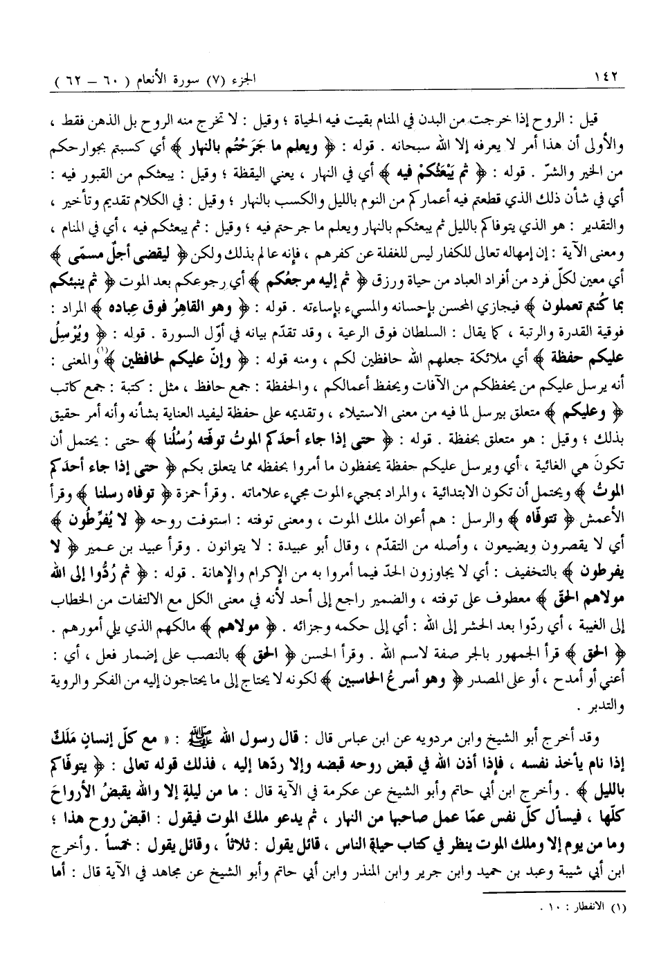 قِيلَ: الرُّوحُ إِذَا خَرَجَتْ مِنَ الْبَدَنِ فِي الْمَنَامِ بَقِيَتْ فِيهِ الْحَيَاةُ وَقِيلَ: لَا تَخْرُجُ مِنْهُ الرُّوحُ بَلِ الذِّهْنُ فَقَطْ، وَالْأَوْلَى أَنَّ هَذَا أَمْرٌ لَا يَعْرِفُهُ إِلَّا اللَّهُ سُبْحَانَهُ. قَوْلُهُ: وَيَعْلَمُ مَا جَرَحْتُمْ بِالنَّهارِ أَيْ كَسَبْتُمْ بِجَوَارِحِكُمْ مِنَ الْخَيْرِ وَالشَّرِّ. قَوْلُهُ: ثُمَّ يَبْعَثُكُمْ فِيهِ أَيْ فِي النَّهَارِ، يَعْنِي الْيَقَظَةَ وَقِيلَ: يَبْعَثُكُمْ مِنَ الْقُبُورِ فِيهِ: