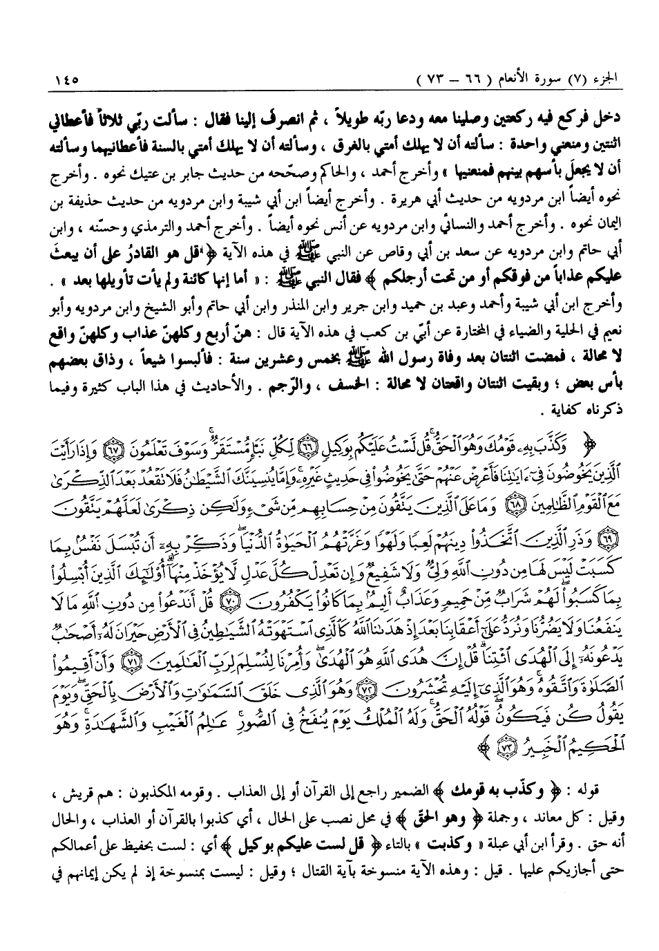 دَخَلَ فَرَكَعَ فِيهِ رَكْعَتَيْنِ وَصَلَّيْنَا مَعَهُ وَدَعَا رَبَّهُ طَوِيلًا، ثُمَّ انْصَرَفَ إِلَيْنَا فَقَالَ: سَأَلْتُ رَبِّي ثَلَاثًا فَأَعْطَانِي اثْنَتَيْنِ وَمَنَعَنِي وَاحِدَةً: سَأَلْتُهُ أَنْ لَا يُهْلِكَ أُمَّتِي بِالْغَرَقِ، وَسَأَلْتُهُ أَنْ لَا يُهْلِكَ أُمَّتِي بِالسَّنَةِ فَأَعْطَانِيهِمَا وَسَأَلْتُهُ أَنْ لَا يَجْعَلَ بَأْسَهُمْ بَيْنَهُمْ فَمَنَعَنِيهَا» وَأَخْرَجَ أَحْمَدُ، وَالْحَاكِمُ وَصَحَّحَهُ مِنْ حَدِيثِ جَابِرِ بْنِ عَتِيكٍ نَحْوَهُ. وَأَخْرَجَ نَحْوَهُ أَيْضًا ابْنُ مَرْدَوَيْهِ مِنْ حَدِيثِ أَبِي هُرَيْرَةَ. وَأَخْرَجَ أَيْضًا ابْنُ أَبِي شَيْبَةَ وَابْنُ مَرْدَوَيْهِ مِنْ حَدِيثِ حُذَيْفَةَ بْنِ الْيَمَانِ نَحْوَهُ. وَأَخْرَجَ أَحْمَدُ وَالنَّسَائِيُّ وَابْنُ مَرْدَوَيْهِ عَنْ أَنَسٍ نَحْوَهُ أَيْضًا. وَأَخْرَجَ أَحْمَدُ وَالتِّرْمِذِيُّ وَحَسَّنَهُ، وَابْنُ أَبِي حَاتِمٍ وَابْنُ مَرْدَوَيْهِ عَنْ سَعْدِ بْنِ أَبِي وَقَّاصٍ عَنِ النَّبِيِّ صَلَّى اللَّهُ عَلَيْهِ وَسَلَّمَ فِي هَذِهِ الْآيَةِ قُلْ هُوَ الْقادِرُ عَلى أَنْ يَبْعَثَ عَلَيْكُمْ عَذاباً مِنْ فَوْقِكُمْ أَوْ مِنْ تَحْتِ أَرْجُلِكُمْ فَقَالَ النَّبِيُّ صَلَّى الله عليه وَسَلَّمَ: «أَمَا إِنَّهَا كَائِنَةٌ وَلَمْ يَأْتِ تَأْوِيلُهَا بَعْدُ» .