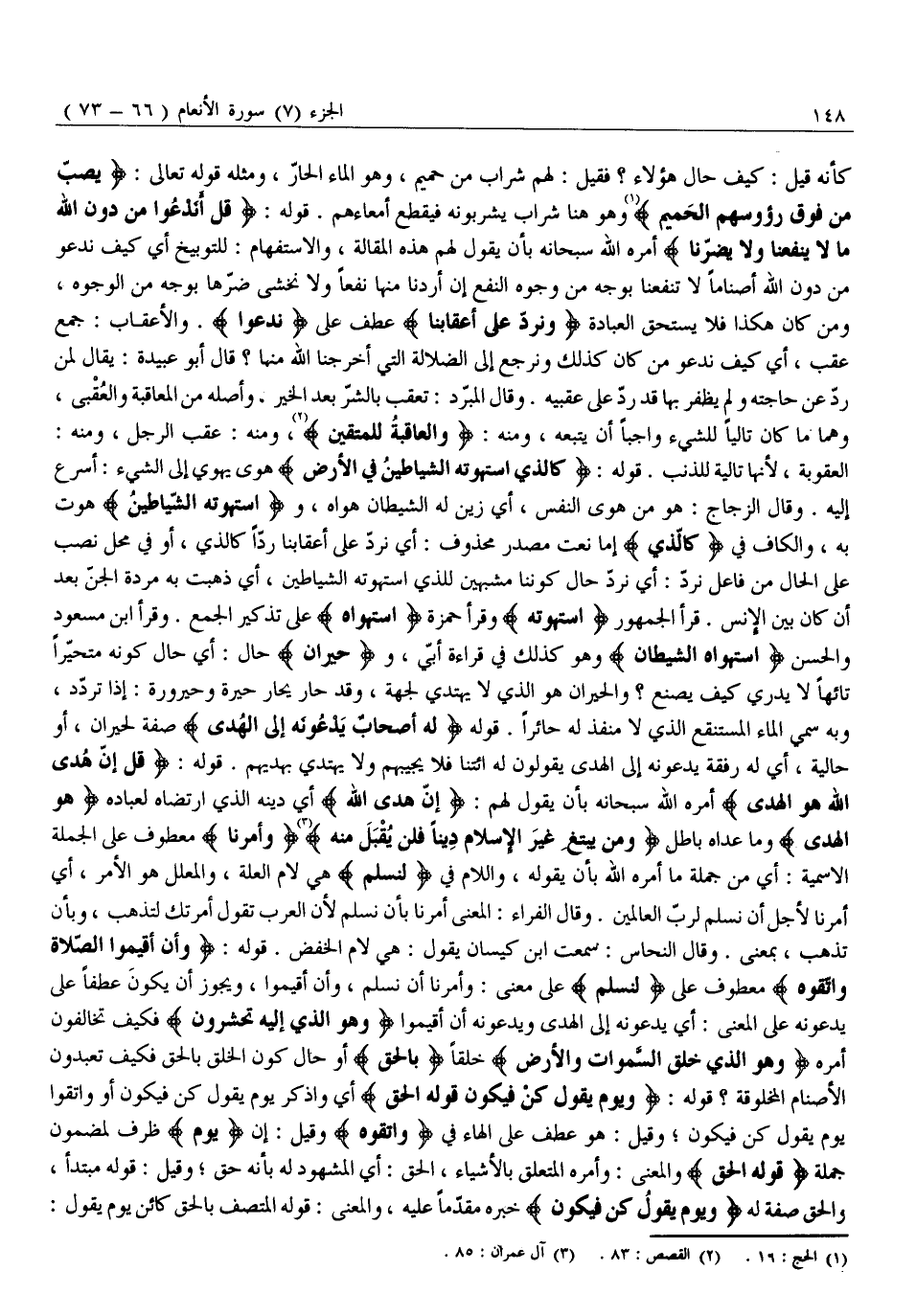 الْعُقُوبَةُ، لِأَنَّهَا تَالِيَةٌ لِلذَّنْبِ. قَوْلُهُ: كَالَّذِي اسْتَهْوَتْهُ الشَّياطِينُ فِي الْأَرْضِ هَوَى يَهْوِي إِلَى الشَّيْءِ: أَسْرَعَ إِلَيْهِ. وَقَالَ الزَّجَّاجُ: هُوَ مِنْ هَوَى النَّفْسِ، أَيْ زَيَّنَ له الشيطان هواه، واسْتَهْوَتْهُ الشَّياطِينُ هَوَتْ بِهِ، وَالْكَافُ فِي كَالَّذِي إِمَّا نَعْتُ مَصْدَرٍ مَحْذُوفٍ: أَيْ نُرَدُّ عَلَى أَعْقَابِنَا رَدًّا كَالَّذِي، أَوْ فِي مَحَلِّ نَصْبٍ عَلَى الْحَالِ مِنْ فَاعِلِ نُرَدُّ: أَيْ نُرَدُّ حَالَ كَوْنِنَا مُشْبِهِينَ لِلَّذِي اسْتَهْوَتْهُ الشَّيَاطِينُ، أَيْ ذَهَبَتْ بِهِ مَرَدَةُ الْجِنِّ بَعْدَ أَنْ كَانَ بَيْنَ الْإِنْسِ. قَرَأَ الْجُمْهُورُ اسْتَهْوَتْهُ وَقَرَأَ حَمْزَةُ اسْتَهْوَاهُ عَلَى تَذْكِيرِ الْجَمْعِ. وَقَرَأَ ابْنُ مَسْعُودٍ وَالْحَسَنُ اسْتَهْوَاهُ الشَّيْطَانُ وَهُوَ كَذَلِكَ فِي قِرَاءَةِ أُبَيٍّ، وحَيْرانَ حَالٌ: أَيْ حَالَ كَوْنِهِ مُتَحَيِّرًا تَائِهًا لَا يَدْرِي كَيْفَ يَصْنَعُ؟ وَالْحَيْرَانُ هُوَ الَّذِي لَا يهتدي لجهة، وقد حار يحار حَيْرَةً وَحَيْرُورَةً: إِذَا تَرَدَّدَ، وَبِهِ سُمِّيَ الْمَاءُ الْمُسْتَنْقَعُ الَّذِي لَا مَنْفَذَ لَهُ حَائِرًا. قَوْلُهُ لَهُ أَصْحابٌ يَدْعُونَهُ إِلَى الْهُدَى صِفَةٌ لِحَيْرَانَ، أَوْ حَالِيَّةٌ، أَيْ لَهُ رُفْقَةٌ يَدْعُونَهُ إِلَى الْهُدَى يَقُولُونَ لَهُ ائْتِنَا فَلَا يُجِيبُهُمْ وَلَا يَهْتَدِي بِهَدْيِهِمْ. قَوْلُهُ: قُلْ إِنَّ هُدَى اللَّهِ هُوَ الْهُدى أَمَرَهُ اللَّهُ سُبْحَانَهُ بِأَنْ يَقُولَ لَهُمْ: إِنَّ هُدَى اللَّهِ أَيْ دِينَهُ الَّذِي ارْتَضَاهُ لِعِبَادِهِ هُوَ الْهُدى وَمَا عَدَاهُ بَاطِلٌ وَمَنْ يَبْتَغِ غَيْرَ الْإِسْلامِ دِيناً فَلَنْ يُقْبَلَ مِنْهُ «3» وَأُمِرْنا مَعْطُوفٌ عَلَى الْجُمْلَةِ الِاسْمِيَّةِ: أَيْ مِنْ جُمْلَةِ مَا أَمَرَهُ اللَّهُ بِأَنْ يَقُولَهُ، وَاللَّامُ فِي لِنُسْلِمَ هِيَ لَامُ الْعِلَّةِ، وَالْمُعَلَّلُ هُوَ الأمر، أي أمرنا لأجل أن نُسْلِمَ لِرَبِّ الْعَالَمِينَ. وَقَالَ الْفَرَّاءُ: الْمَعْنَى أُمِرْنَا بِأَنْ نُسْلِمَ لِأَنَّ الْعَرَبَ تَقُولُ أَمَرْتُكَ لِتَذْهَبَ، وَبِأَنْ تَذْهَبَ، بِمَعْنًى. وَقَالَ النَّحَّاسُ: سَمِعْتُ ابْنَ كَيْسَانَ يَقُولُ: هِيَ لَامُ الْخَفْضِ. قَوْلُهُ: وَأَنْ أَقِيمُوا الصَّلاةَ وَاتَّقُوهُ مَعْطُوفٌ عَلَى لِنُسْلِمَ عَلَى مَعْنَى: وَأُمْرَنَا أَنْ نُسْلِمَ، وَأَنْ أَقِيمُوا، وَيَجُوزُ أَنْ يَكُونَ عَطْفًا عَلَى يَدْعُونَهُ عَلَى الْمَعْنَى: أَيْ يَدْعُونَهُ إِلَى الْهُدَى وَيَدْعُونَهُ أَنْ أَقِيمُوا وَهُوَ الَّذِي إِلَيْهِ تُحْشَرُونَ فَكَيْفَ تُخَالِفُونَ أَمْرَهُ وَهُوَ الَّذِي خَلَقَ السَّماواتِ وَالْأَرْضَ خَلْقًا بِالْحَقِّ أَوْ حَالَ كَوْنِ الْخَلْقِ بِالْحَقِّ فَكَيْفَ تَعْبُدُونَ الْأَصْنَامَ الْمَخْلُوقَةَ؟ قَوْلُهُ: وَيَوْمَ يَقُولُ كُنْ فَيَكُونُ قَوْلُهُ الْحَقُّ أَيْ وَاذْكُرْ يَوْمَ يَقُولُ كُنْ فَيَكُونُ أَوْ وَاتَّقُوا يَوْمَ يَقُولُ كُنْ فَيَكُونُ وَقِيلَ: هُوَ عَطْفٌ عَلَى الْهَاءِ فِي وَاتَّقُوهُ وَقِيلَ: إِنَّ يَوْمَ ظَرْفٌ لِمَضْمُونِ جُمْلَةِ قَوْلُهُ الْحَقُّ وَالْمَعْنَى: وَأَمْرُهُ الْمُتَعَلِّقُ بِالْأَشْيَاءِ، الْحَقُّ: أَيِ الْمَشْهُودُ لَهُ بِأَنَّهُ حَقٌّ وَقِيلَ: قَوْلُهُ مُبْتَدَأٌ، وَالْحَقُّ صِفَةٌ لَهُ وَيَوْمَ يَقُولُ كُنْ فَيَكُونُ خَبَرُهُ مُقَدَّمًا عَلَيْهِ، وَالْمَعْنَى: قَوْلُهُ الْمُتَّصِفُ بِالْحَقِّ كائن يوم يقول: