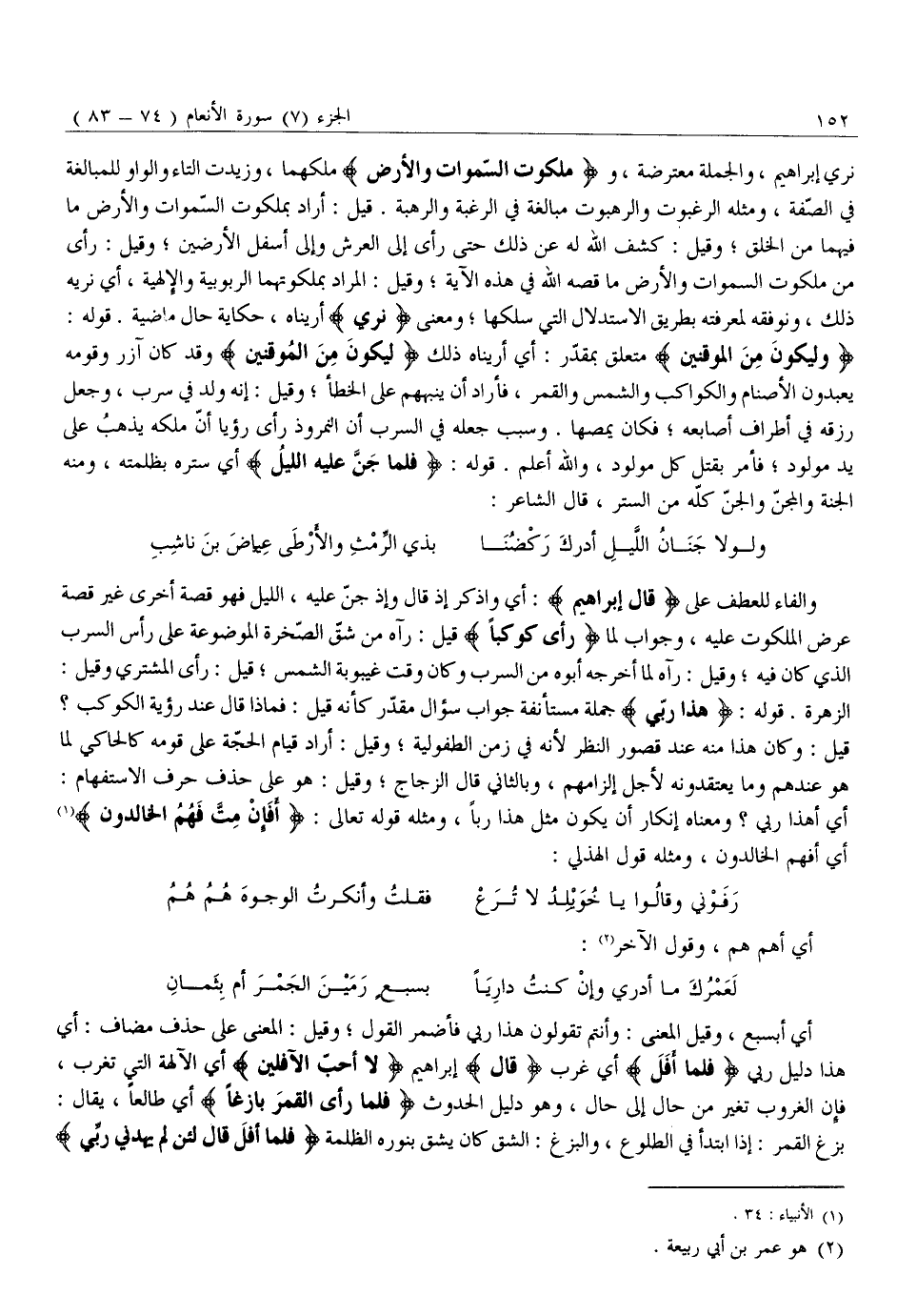 وَلِيَكُونَ مِنَ الْمُوقِنِينَ مُتَعَلِّقٌ بِمُقَدَّرٍ: أَيْ أَرَيْنَاهُ ذَلِكَ لِيَكُونَ مِنَ الْمُوقِنِينَ وَقَدْ كَانَ آزَرُ وَقَوْمُهُ يَعْبُدُونَ الْأَصْنَامَ وَالْكَوَاكِبَ وَالشَّمْسَ وَالْقَمَرَ، فَأَرَادَ أَنْ يُنَبِّهَهُمْ عَلَى الْخَطَأِ وَقِيلَ: إِنَّهُ وُلِدَ فِي سَرَبٍ، وَجُعِلَ رِزْقُهُ فِي أَطْرَافِ أَصَابِعِهِ فَكَانَ يَمُصُّهَا. وَسَبَبُ جَعْلِهِ فِي السَّرَبِ أَنَّ النُّمْرُوذَ رَأَى رُؤْيَا أَنَّ مُلْكَهُ يَذْهَبُ عَلَى يَدِ مَوْلُودٍ فَأَمَرَ بِقَتْلِ كُلِّ مَوْلُودٍ، وَاللَّهُ أَعْلَمُ. قَوْلُهُ: فَلَمَّا جَنَّ عَلَيْهِ اللَّيْلُ أَيْ سَتَرَهُ بِظُلْمَتِهِ، وَمِنْهُ الْجَنَّةُ وَالْمِجَنُّ وَالْجِنُّ كُلُّهُ مِنَ السَّتْرِ، قَالَ الشَّاعِرُ: