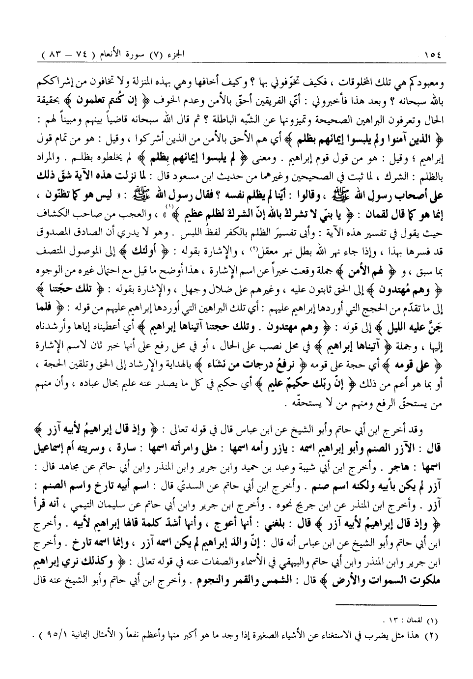 آزَرُ. وَأَخْرَجَ ابْنُ الْمُنْذِرِ عَنِ ابْنِ جُرَيْجٍ نَحْوَهُ. وَأَخْرَجَ ابْنُ جَرِيرٍ وَابْنُ أَبِي حَاتِمٍ عَنْ سُلَيْمَانَ التَّيْمِيِّ، أَنَّهُ قَرَأَ وَإِذْ قالَ إِبْراهِيمُ لِأَبِيهِ آزَرَ قَالَ: بَلَغَنِي: أَنَّهَا أَعْوَجُ، وَأَنَّهَا أَشَدُّ كَلِمَةٍ قَالَهَا إِبْرَاهِيمُ لِأَبِيهِ. وَأَخْرَجَ ابْنُ أَبِي حَاتِمٍ وَأَبُو الشَّيْخِ عَنْ ابْنِ عَبَّاسٍ أَنَّهُ قَالَ: إِنَّ وَالِدَ إِبْرَاهِيمَ لَمْ يَكُنِ اسْمُهُ آزَرَ، وَإِنَّمَا اسْمُهُ تَارَخُ. وَأَخْرَجَ ابْنُ جَرِيرٍ وَابْنُ الْمُنْذِرِ وَابْنُ أَبِي حَاتِمٍ وَالْبَيْهَقِيُّ فِي الْأَسْمَاءِ وَالصِّفَاتِ عَنْهُ فِي قَوْلِهِ تَعَالَى: وَكَذلِكَ نُرِي إِبْراهِيمَ مَلَكُوتَ السَّماواتِ وَالْأَرْضِ قَالَ: الشَّمْسُ وَالْقَمَرُ وَالنُّجُومُ. وَأَخْرَجَ ابْنُ أَبِي حَاتِمٍ وَأَبُو الشَّيْخِ عَنْهُ قال
