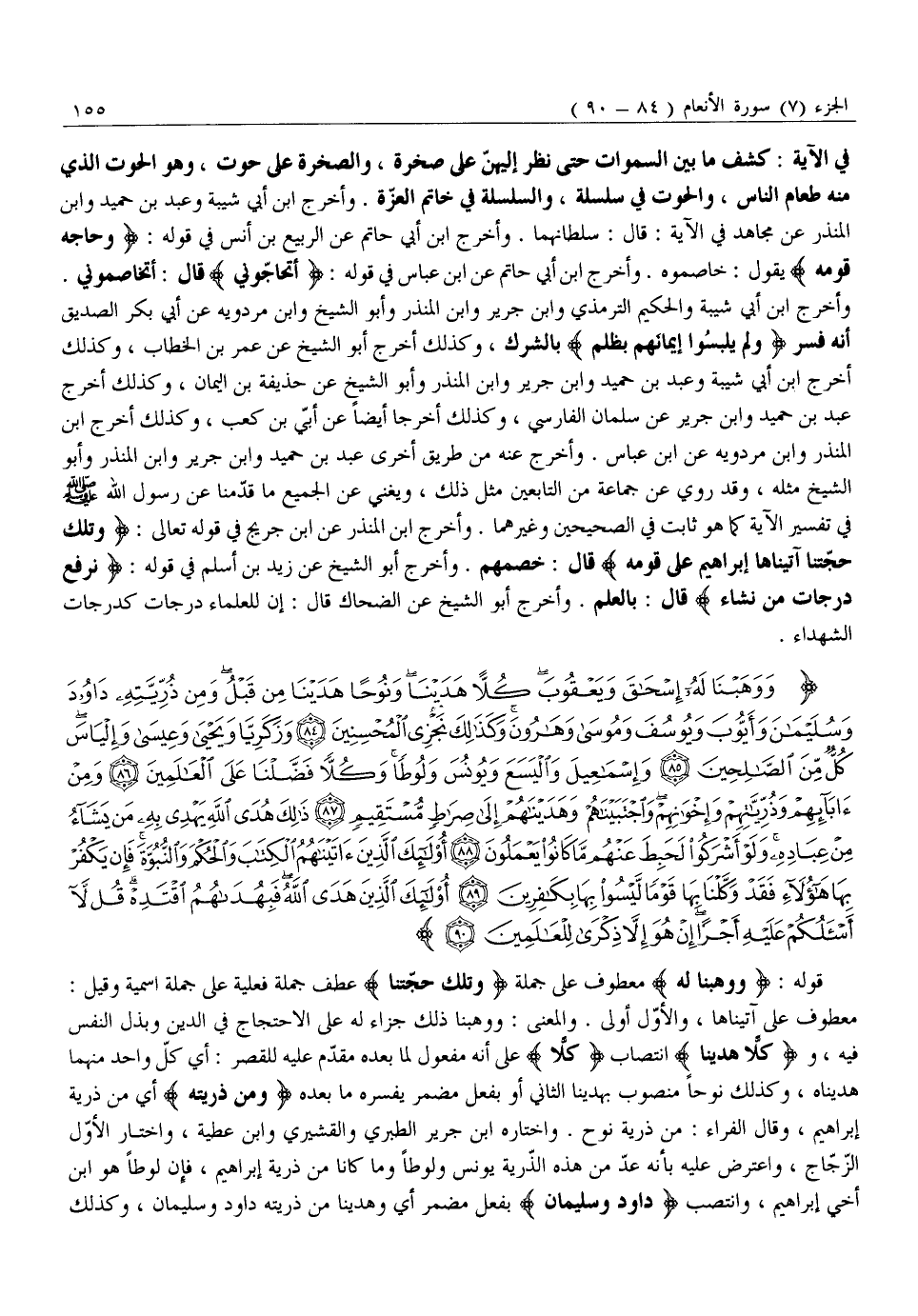 مَعْطُوفٌ عَلَى آتَيْنَاهَا، وَالْأَوَّلُ أَوْلَى. وَالْمَعْنَى: وَوَهَبْنَا ذَلِكَ جَزَاءً لَهُ عَلَى الِاحْتِجَاجِ فِي الدِّينِ وبذل النفس فيه، وكُلًّا هَدَيْنا انْتِصَابُ كُلًّا عَلَى أَنَّهُ مَفْعُولٌ لِمَا بَعْدَهُ مُقَدَّمٌ عَلَيْهِ لِلْقَصْرِ: أَيْ كُلَّ وَاحِدٍ مِنْهُمَا هَدَيْنَاهُ، وَكَذَلِكَ نُوحًا مَنْصُوبٌ بِهَدَيْنَا الثَّانِي أَوْ بِفِعْلٍ مُضْمَرٍ يُفَسِّرُهُ مَا بَعْدَهُ وَمِنْ ذُرِّيَّتِهِ أَيْ مِنْ ذُرِّيَّةِ إِبْرَاهِيمَ، وَقَالَ الْفَرَّاءُ: مِنْ ذُرِّيَّةِ نُوحٍ. وَاخْتَارَهُ ابْنُ جَرِيرٍ الطَّبَرَيُّ وَالْقُشَيْرِيُّ وَابْنُ عَطِيَّةَ، وَاخْتَارَ الْأَوَّلَ الزَّجَّاجُ، وَاعْتُرِضَ عَلَيْهِ بِأَنَّهُ عَدَّ مِنْ هَذِهِ الذُّرِّيَّةِ يُونُسَ وَلُوطًا وَمَا كَانَا مِنْ ذُرِّيَّةِ إِبْرَاهِيمَ، فَإِنَّ لُوطًا هُوَ ابْنُ أَخِي إِبْرَاهِيمَ، وَانْتَصَبَ داوُدَ وَسُلَيْمانَ بِفِعْلٍ مُضْمَرٍ أَيْ وَهَدَيْنَا مِنْ ذُرِّيَّتِهِ دَاوُدَ وَسُلَيْمَانَ، وَكَذَلِكَ