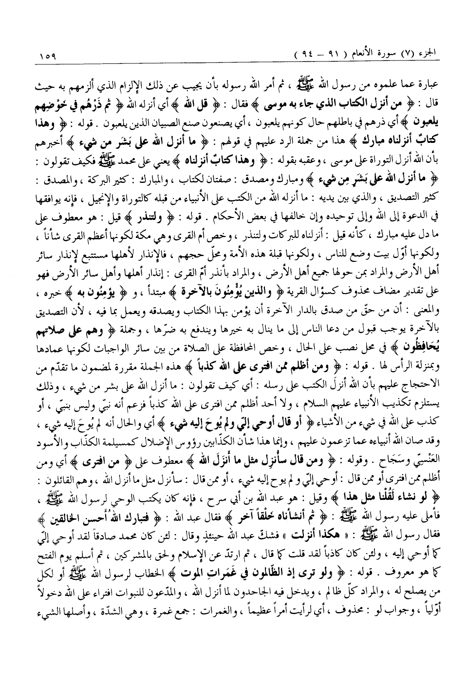 عِبَارَةً عَمَّا عَلِمُوهُ مِنْ رَسُولِ اللَّهِ صَلَّى اللَّهُ عَلَيْهِ وَسَلَّمَ، ثم أمر اللَّهُ رَسُولَهُ بِأَنْ يُجِيبَ عَنْ ذَلِكَ الْإِلْزَامِ الَّذِي أَلْزَمَهُمْ بِهِ حَيْثُ قَالَ: مَنْ أَنْزَلَ الْكِتابَ الَّذِي جاءَ بِهِ مُوسى فَقَالَ: قُلِ اللَّهُ أَيْ أَنْزَلَهُ اللَّهُ ثُمَّ ذَرْهُمْ فِي خَوْضِهِمْ يَلْعَبُونَ أَيْ ذَرْهُمْ فِي بَاطِلِهِمْ حَالَ كَوْنِهِمْ يَلْعَبُونَ، أَيْ يَصْنَعُونَ صُنْعَ الصِّبْيَانِ الَّذِينَ يَلْعَبُونَ. قَوْلُهُ: وَهذا كِتابٌ أَنْزَلْناهُ مُبارَكٌ هَذَا مِنْ جُمْلَةِ الرَّدِّ عَلَيْهِمْ فِي قَوْلِهِمْ: مَا أَنْزَلَ اللَّهُ عَلى بَشَرٍ مِنْ شَيْءٍ أَخْبَرَهُمْ بِأَنَّ اللَّهَ أَنْزَلَ التَّوْرَاةَ عَلَى مُوسَى، وَعَقَّبَهُ بِقَوْلِهِ: وَهذا كِتابٌ أَنْزَلْناهُ يَعْنِي عَلَى مُحَمَّدٍ صلّى الله عليه وَسَلَّمَ فَكَيْفَ تَقُولُونَ: