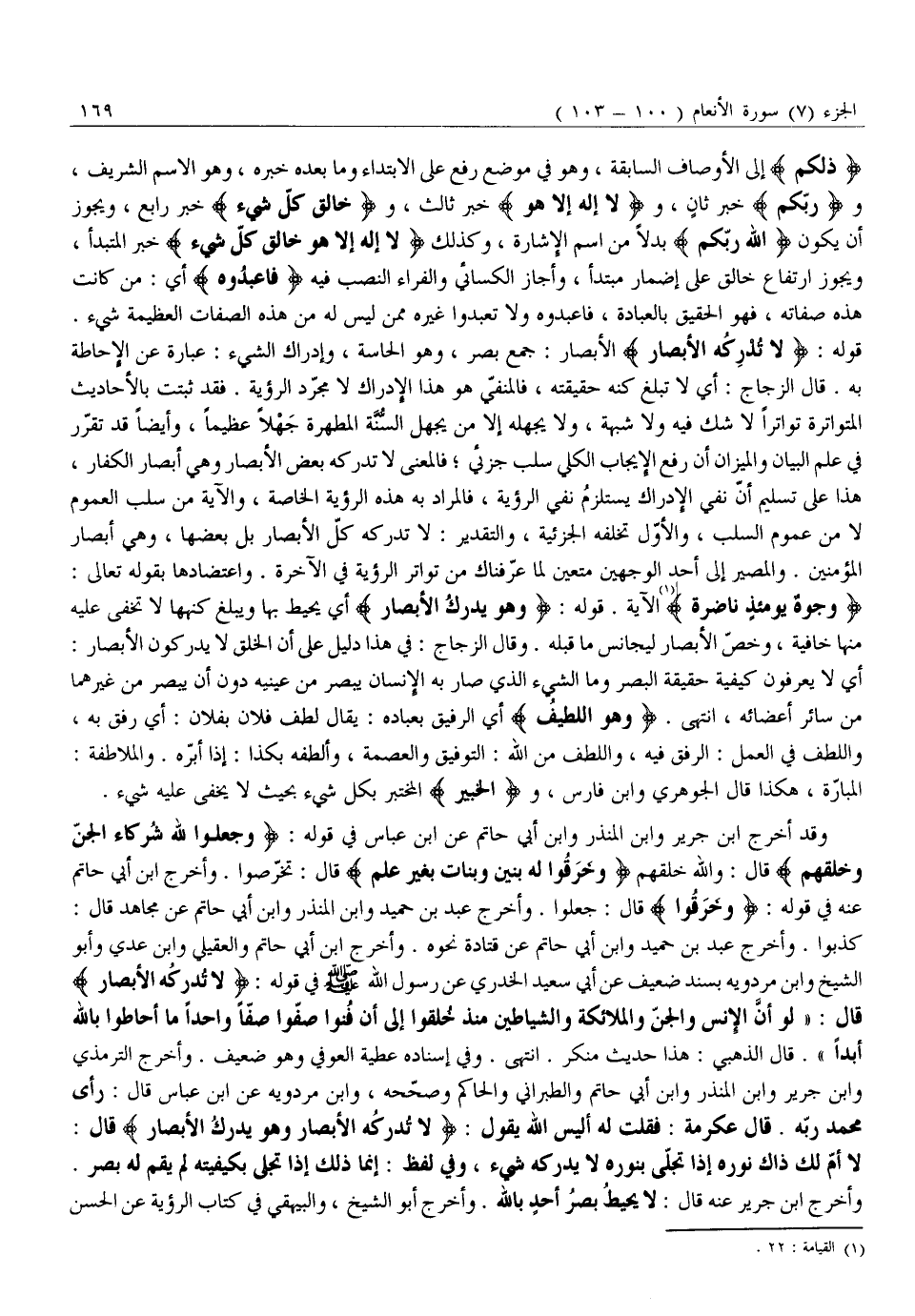 قَوْلُهُ: لَا تُدْرِكُهُ الْأَبْصارُ الْأَبْصَارُ: جَمْعُ بَصَرٍ، وَهُوَ الْحَاسَّةُ، وَإِدْرَاكُ الشَّيْءِ: عِبَارَةٌ عَنِ الْإِحَاطَةِ بِهِ. قَالَ الزَّجَّاجُ: أَيْ لَا تَبْلُغُ كُنْهَ حَقِيقَتِهِ، فَالْمَنْفِيُّ هُوَ هَذَا الْإِدْرَاكُ لَا مُجَرَّدَ الرُّؤْيَةِ. فَقَدْ ثَبَتَتْ بِالْأَحَادِيثِ الْمُتَوَاتِرَةِ تَوَاتُرًا لَا شَكَّ فِيهِ وَلَا شُبْهَةَ، وَلَا يَجْهَلُهُ إِلَّا مَنْ يَجْهَلُ السُّنَّةَ الْمُطَهَّرَةَ جَهْلًا عَظِيمًا، وَأَيْضًا قَدْ تَقَرَّرَ فِي عِلْمِ الْبَيَانِ وَالْمِيزَانِ أَنَّ رَفْعَ الْإِيجَابِ الْكُلِّيِّ سَلْبٌ جُزْئِيُّ فَالْمَعْنَى لَا تُدْرِكُهُ بَعْضُ الْأَبْصَارِ وَهِيَ أَبْصَارُ الْكُفَّارِ، هَذَا عَلَى تَسْلِيمِ أَنَّ نَفْيَ الْإِدْرَاكِ يَسْتَلْزِمُ نَفْيَ الرُّؤْيَةِ، فَالْمُرَادُ بِهِ هَذِهِ الرُّؤْيَةُ الْخَاصَّةُ، وَالْآيَةُ مِنْ سَلْبِ الْعُمُومِ لَا مِنْ عُمُومِ السَّلْبِ، وَالْأَوَّلُ تَخْلُفُهُ الْجُزْئِيَّةُ، وَالتَّقْدِيرُ: لَا تُدْرِكُهُ كُلُّ الْأَبْصَارِ بَلْ بَعْضُهَا، وَهِيَ أَبْصَارُ الْمُؤْمِنِينَ. وَالْمَصِيرُ إِلَى أَحَدِ الْوَجْهَيْنِ مُتَعَيَّنٌ لِمَا عَرَّفْنَاكَ مِنْ تَوَاتُرِ الرُّؤْيَةِ فِي الْآخِرَةِ. وَاعْتِضَادِهَا بِقَوْلِهِ تَعَالَى:
