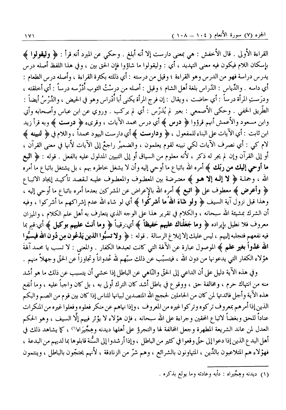 الطَّرِيقُ الْخَفِيُّ. وَحَكَى الْأَصْمَعِيُّ: بَعِيرٌ لَمْ يُدْرَسْ: أَيْ لَمْ يُرْكَبْ. وَرُوِيَ عَنِ ابْنِ عَبَّاسٍ وَأَصْحَابِهِ وَأُبَيٍّ وَابْنِ مَسْعُودٍ والأعمش أنهم قرءوا دَرَسَ أَيْ دَرَسَ مُحَمَّدٌ الْآيَاتِ، وَقُرِئَ دُرِسَتْ وبه قرأ زيد ابن ثَابِتٍ: أَيِ الْآيَاتِ عَلَى الْبِنَاءِ لِلْمَفْعُولِ، وَدَارَسَتْ أَيْ دَارَسَتِ الْيَهُودُ مُحَمَّدًا، وَاللَّامُ فِي لِنُبَيِّنَهُ لَامُ كَيْ: أَيْ نُصَرِّفُ الْآيَاتِ لِكَيْ نُبَيِّنَهُ لِقَوْمٍ يَعْلَمُونَ، وَالضَّمِيرُ رَاجِعٌ إِلَى الْآيَاتِ لِأَنَّهَا فِي مَعْنَى الْقُرْآنِ، أَوْ إِلَى الْقُرْآنِ وَإِنْ لَمْ يَجْرِ لَهُ ذِكْرٌ، لِأَنَّهُ مَعْلُومٌ مِنَ السِّيَاقِ أَوْ إِلَى التَّبْيِينِ الْمَدْلُولِ عَلَيْهِ بِالْفِعْلِ. قَوْلُهُ: اتَّبِعْ مَا أُوحِيَ إِلَيْكَ مِنْ رَبِّكَ أَمَرَهُ اللَّهُ بِاتِّبَاعِ مَا أُوحِيَ إِلَيْهِ وَأَنْ لَا يَشْغَلَ خَاطِرَهُ بِهِمْ، بَلْ يَشْتَغِلُ بِاتِّبَاعِ مَا أَمَرَهُ اللَّهُ، وَجُمْلَةُ لَا إِلهَ إِلَّا هُوَ مُعْتَرِضَةٌ بَيْنَ الْمَعْطُوفِ وَالْمَعْطُوفِ عَلَيْهِ لِقَصْدِ تأكيد إيجاد الِاتِّبَاعِ وَأَعْرِضْ مَعْطُوفٌ عَلَى اتَّبِعْ أَمَرَهُ اللَّهُ بالإعراض عن المشركين بعد ما أَمَرَهُ بِاتِّبَاعِ مَا أُوحِيَ إِلَيْهِ، وَهَذَا قَبْلَ نُزُولِ آيَةِ السَّيْفِ وَلَوْ شاءَ اللَّهُ مَا أَشْرَكُوا أَيْ لَوْ شَاءَ اللَّهُ عَدَمَ إِشْرَاكِهِمْ مَا أَشْرَكُوا، وَفِيهِ أَنَّ الشِّرْكَ بِمَشِيئَةِ اللَّهِ سُبْحَانَهُ، وَالْكَلَامُ فِي تَقْرِيرِ هَذَا عَلَى الْوَجْهِ الَّذِي يَتَعَارَفُ بِهِ أَهْلُ عِلْمِ الْكَلَامِ، وَالْمِيزَانِ مَعْرُوفٌ فَلَا نُطِيلُ بِإِيرَادِهِ وَما جَعَلْناكَ عَلَيْهِمْ حَفِيظاً أَيْ: رَقِيبًا وَما أَنْتَ عَلَيْهِمْ بِوَكِيلٍ أَيْ: قَيِّمٍ بِمَا فِيهِ نَفْعُهُمْ فَتَجْلِبُهُ إِلَيْهِمْ، لَيْسَ عَلَيْكَ إِلَّا إِبْلَاغُ الرِّسَالَةِ. قَوْلُهُ: وَلا تَسُبُّوا الَّذِينَ يَدْعُونَ مِنْ دُونِ اللَّهِ فَيَسُبُّوا اللَّهَ عَدْواً بِغَيْرِ عِلْمٍ الْمَوْصُولُ عِبَارَةٌ عَنِ الْآلِهَةِ الَّتِي كَانَتْ تَعْبُدُهَا الْكُفَّارُ. وَالْمَعْنَى: لَا تَسُبُّ يَا مُحَمَّدُ آلِهَةَ هَؤُلَاءِ الْكُفَّارِ الَّتِي يَدْعُونَهَا مِنْ دُونِ اللَّهِ، فَيَتَسَبَّبُ عَنْ ذَلِكَ سَبُّهُمْ لِلَّهِ عُدْوَانًا وَتَجَاوُزًا عَنِ الْحَقِّ وَجَهْلًا مِنْهُمْ.