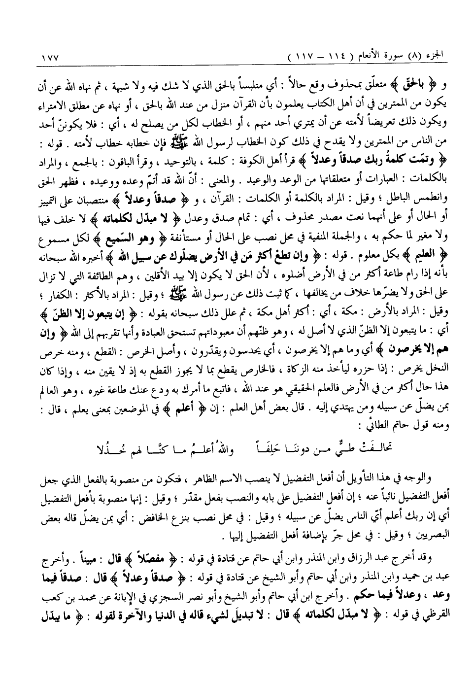وَتَمَّتْ كَلِمَةُ رَبِّكَ صِدْقاً وَعَدْلًا قَرَأَ أَهْلُ الْكُوفَةِ: كَلِمَةً، بِالتَّوْحِيدِ، وَقَرَأَ الْبَاقُونَ: بِالْجَمْعِ، وَالْمُرَادُ بِالْكَلِمَاتِ: الْعِبَارَاتُ أَوْ مُتَعَلِّقَاتُهَا مِنَ الْوَعْدِ وَالْوَعِيدِ. وَالْمَعْنَى: أَنَّ اللَّهَ قَدْ أَتَمَّ وَعْدَهُ وَوَعِيدَهُ، فَظَهَرَ الْحَقُّ وَانْطَمَسَ الْبَاطِلُ وَقِيلَ: الْمُرَادُ بِالْكَلِمَةِ أَوِ الْكَلِمَاتِ: القرآن، وصِدْقاً وَعَدْلًا مُنْتَصِبَانِ عَلَى التَّمْيِيزِ أَوِ الْحَالِ أَوْ عَلَى أَنَّهُمَا نَعْتُ مَصْدَرٍ مَحْذُوفٍ، أَيْ: تَمَامُ صِدْقٍ وَعَدْلٍ لَا مُبَدِّلَ لِكَلِماتِهِ لَا خُلْفَ فِيهَا وَلَا مُغَيِّرَ لِمَا حَكَمَ بِهِ، وَالْجُمْلَةُ الْمَنْفِيَّةُ فِي مَحَلِّ نَصْبٍ عَلَى الْحَالِ أَوْ مُسْتَأْنَفَةٌ وَهُوَ السَّمِيعُ لِكُلِّ مَسْمُوعٍ الْعَلِيمُ بِكُلِّ مَعْلُومٍ. قَوْلُهُ: وَإِنْ تُطِعْ أَكْثَرَ مَنْ فِي الْأَرْضِ يُضِلُّوكَ عَنْ سَبِيلِ اللَّهِ أَخْبَرَهُ اللَّهُ سُبْحَانَهُ بِأَنَّهُ إِذَا رَامَ طَاعَةَ أَكْثَرَ مَنْ فِي الْأَرْضِ أَضَلُّوهُ، لِأَنَّ الْحَقَّ لَا يَكُونُ إلا بيد الأقلين، وهم الطائفة التي لا تَزَالُ عَلَى الْحَقِّ وَلَا يَضُرُّهَا خِلَافُ مَنْ يُخَالِفُهَا، كَمَا ثَبَتَ ذَلِكَ عَنْ رَسُولِ اللَّهِ صَلَّى اللَّهُ عَلَيْهِ وَسَلَّمَ وَقِيلَ: الْمُرَادُ بِالْأَكْثَرِ: الْكُفَّارُ وَقِيلَ: الْمُرَادُ بِالْأَرْضِ: مَكَّةَ، أَيْ: أَكْثَرَ أَهْلِ مَكَّةَ، ثُمَّ عَلَّلَ ذَلِكَ سُبْحَانَهُ بِقَوْلِهِ: إِنْ يَتَّبِعُونَ إِلَّا الظَّنَّ أَيْ: مَا يَتَّبِعُونَ إِلَّا الظَّنَّ الَّذِي لَا أَصْلَ لَهُ، وَهُوَ ظَنُّهُمْ أَنَّ مَعْبُودَاتِهِمْ تَسْتَحِقُّ الْعِبَادَةَ وَأَنَّهَا تُقَرِّبُهُمْ إِلَى اللَّهِ وَإِنْ هُمْ إِلَّا يَخْرُصُونَ أَيْ وَمَا هُمْ إِلَّا يَخْرُصُونَ، أَيْ يَحْدِسُونَ وَيُقَدِّرُونَ، وَأَصْلُ الْخَرْصِ: الْقَطْعُ، وَمِنْهُ خَرَصَ النَّخْلَ يَخْرُصُ: إِذَا حَزَرَهُ لِيَأْخُذَ مِنْهُ الزَّكَاةَ، فَالْخَارِصُ يَقْطَعُ بِمَا لَا يَجُوزُ الْقَطْعُ بِهِ إِذْ لَا يَقِينَ مِنْهُ، وَإِذَا كَانَ هَذَا حَالَ أَكْثَرِ مَنْ فِي الْأَرْضِ فَالْعِلْمُ الْحَقِيقِيُّ هُوَ عِنْدَ اللَّهِ، فَاتَّبِعْ مَا أَمَرَكَ بِهِ وَدَعْ عَنْكَ طَاعَةَ غَيْرِهِ، وَهُوَ الْعَالِمُ بِمَنْ يَضِلُّ عَنْ سَبِيلِهِ وَمَنْ يَهْتَدِي إِلَيْهِ. قَالَ بَعْضُ أَهْلِ الْعِلْمِ: إِنَّ أَعْلَمُ فِي الْمَوْضِعَيْنِ بِمَعْنَى يَعْلَمُ، قَالَ: