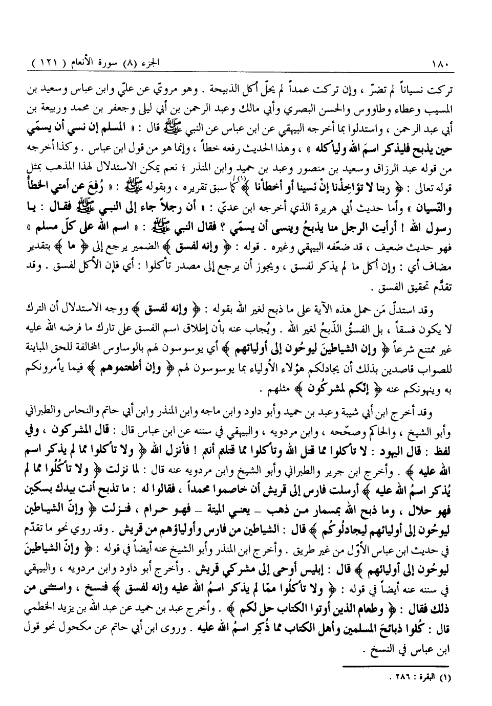 وَقَدْ أَخْرَجَ ابْنُ أَبِي شَيْبَةَ وَعَبْدُ بْنُ حُمَيْدٍ وَأَبُو دَاوُدَ وَابْنُ مَاجَهْ وَابْنُ الْمُنْذِرِ وَابْنُ أَبِي حَاتِمٍ وَالنَّحَّاسُ وَالطَّبَرَانِيُّ وَأَبُو الشَّيْخِ، وَالْحَاكِمُ وَصَحَّحَهُ، وَابْنُ مَرْدَوَيْهِ، وَالْبَيْهَقِيُّ فِي سُنَنِهِ عَنِ ابْنِ عَبَّاسٍ قَالَ: قَالَ الْمُشْرِكُونَ، وَفِي لَفْظٍ: قَالَ الْيَهُودُ: لَا تَأْكُلُوا مِمَّا قَتَلَ اللَّهُ وَتَأْكُلُوا مِمَّا قَتَلْتُمْ أَنْتُمْ! فَأَنْزَلَ اللَّهُ وَلا تَأْكُلُوا مِمَّا لَمْ يُذْكَرِ اسْمُ اللَّهِ عَلَيْهِ. وَأَخْرَجَ ابْنُ جَرِيرٍ وَالطَّبَرَانِيُّ وَأَبُو الشَّيْخِ وَابْنُ مَرْدَوَيْهِ عَنْهُ قَالَ: لَمَّا نَزَلَتْ وَلا تَأْكُلُوا مِمَّا لَمْ يُذْكَرِ اسْمُ اللَّهِ عَلَيْهِ أَرْسَلَتْ فَارِسُ إِلَى قُرَيْشٍ أَنْ خَاصِمُوا مُحَمَّدًا، فَقَالُوا لَهُ: مَا تَذْبَحُ أَنْتَ بِيَدِكَ بِسِكِّينٍ فَهُوَ حَلَالٌ، وَمَا ذَبَحَ الله بمسمار مِنْ ذَهَبٍ- يَعْنِي الْمَيْتَةَ- فَهُوَ حَرَامٌ، فَنَزَلَتْ وَإِنَّ الشَّياطِينَ لَيُوحُونَ إِلى أَوْلِيائِهِمْ لِيُجادِلُوكُمْ قَالَ: الشَّيَاطِينُ مِنْ فَارِسَ وَأَوْلِيَاؤُهُمْ مِنْ قُرَيْشٍ. وَقَدْ رُوِيَ نَحْوُ مَا تَقَدَّمَ فِي حَدِيثِ ابْنِ عَبَّاسٍ الْأَوَّلِ مِنْ غَيْرِ طَرِيقٍ. وَأَخْرَجَ ابْنُ الْمُنْذِرِ وَأَبُو الشَّيْخِ عَنْهُ أَيْضًا فِي قَوْلِهِ: وَإِنَّ الشَّياطِينَ لَيُوحُونَ إِلى أَوْلِيائِهِمْ قَالَ: إِبْلِيسُ أَوْحَى إِلَى مُشْرِكِي قُرَيْشٍ. وَأَخْرَجَ أَبُو دَاوُدَ وَابْنُ مَرْدَوَيْهِ، وَالْبَيْهَقِيُّ فِي سُنَنِهِ عَنْهُ أَيْضًا فِي قَوْلِهِ: وَلا تَأْكُلُوا مِمَّا لَمْ يُذْكَرِ اسْمُ اللَّهِ عَلَيْهِ وَإِنَّهُ لَفِسْقٌ فَنُسِخَ، وَاسْتُثْنِيَ مِنْ ذَلِكَ فَقَالَ: وَطَعامُ الَّذِينَ أُوتُوا الْكِتابَ حِلٌّ لَكُمْ. وَأَخْرَجَ عَبْدُ بْنُ حُمَيْدٍ عَنْ عَبْدِ اللَّهِ بْنِ يَزِيدَ الْخَطْمِيِّ قَالَ: كُلُوا ذَبَائِحَ الْمُسْلِمِينَ وَأَهْلِ الْكِتَابِ مِمَّا ذُكِرَ اسْمُ اللَّهِ عَلَيْهِ. وَرَوَى ابْنُ أَبِي حَاتِمٍ عَنْ مَكْحُولٍ نَحْوَ قَوْلِ ابْنِ عَبَّاسٍ فِي النَّسْخِ.