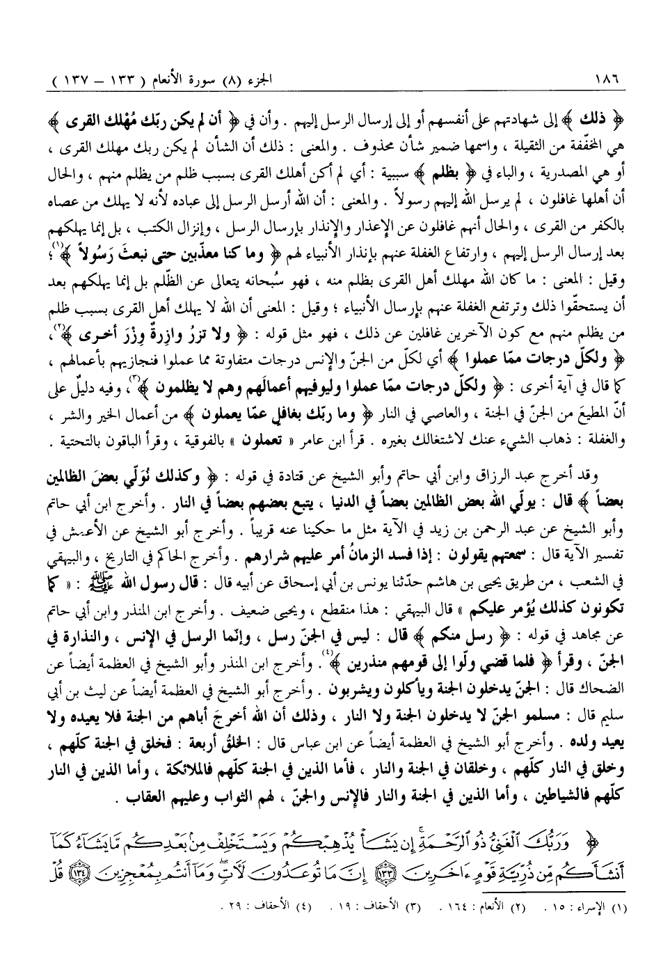ذلِكَ إِلَى شَهَادَتِهِمْ عَلَى أَنْفُسِهِمْ أَوْ إِلَى إِرْسَالِ الرُّسُلِ إِلَيْهِمْ. وَأَنْ فِي أَنْ لَمْ يَكُنْ رَبُّكَ مُهْلِكَ الْقُرى هِيَ الْمُخَفَّفَةُ مِنَ الثَّقِيلَةِ، وَاسْمُهَا ضَمِيرُ شَأْنٍ مَحْذُوفٍ. وَالْمَعْنَى: ذَلِكَ أَنَّ الشَّأْنَ لَمْ يَكُنْ رَبُّكَ مُهْلِكَ الْقُرَى، أَوْ هِيَ الْمَصْدَرِيَّةُ، وَالْبَاءُ فِي بِظُلْمٍ سَبَبِيَّةٌ: أَيْ لَمْ أَكُنْ أُهْلِكُ الْقُرَى بِسَبَبِ ظُلْمِ مَنْ يَظْلِمُ مِنْهُمْ، وَالْحَالُ أَنَّ أَهْلَهَا غَافِلُونَ، لَمْ يُرْسِلِ اللَّهُ إِلَيْهِمْ رَسُولًا. وَالْمَعْنَى: أَنَّ اللَّهَ أَرْسَلَ الرُّسُلَ إِلَى عِبَادِهِ لِأَنَّهُ لَا يُهْلِكُ مَنْ عَصَاهُ بِالْكُفْرِ مِنَ الْقُرَى، وَالْحَالُ أَنَّهُمْ غَافِلُونَ عَنِ الْإِعْذَارِ وَالْإِنْذَارِ بِإِرْسَالِ الرُّسُلِ، وَإِنْزَالِ الْكُتُبِ، بَلْ إِنَّمَا يُهْلِكُهُمْ بَعْدَ إِرْسَالِ الرُّسُلِ إِلَيْهِمْ، وَارْتِفَاعِ الْغَفْلَةِ عَنْهُمْ بِإِنْذَارِ الْأَنْبِيَاءِ لَهُمْ وَما كُنَّا مُعَذِّبِينَ حَتَّى نَبْعَثَ رَسُولًا «1» وَقِيلَ: الْمَعْنَى: مَا كَانَ اللَّهُ مُهْلِكَ أَهْلَ الْقُرَى بِظُلْمٍ مِنْهُ، فَهُوَ سُبْحَانَهُ يَتَعَالَى عَنِ الظُّلْمِ بَلْ إِنَّمَا يُهْلِكُهُمْ بَعْدَ أَنْ يَسْتَحِقُّوا ذَلِكَ وَتَرْتَفِعَ الْغَفْلَةُ عَنْهُمْ بِإِرْسَالِ الْأَنْبِيَاءِ وَقِيلَ: الْمَعْنَى أَنَّ اللَّهَ لَا يُهْلِكُ أَهْلَ الْقُرَى بِسَبَبِ ظُلْمِ مَنْ يَظْلِمُ مِنْهُمْ مَعَ كَوْنِ الْآخَرِينَ غَافِلِينَ عَنْ ذَلِكَ، فَهُوَ مِثْلُ قَوْلِهِ: وَلا تَزِرُ وازِرَةٌ وِزْرَ أُخْرى «2» ، وَلِكُلٍّ دَرَجاتٌ مِمَّا عَمِلُوا أَيْ لِكُلٍّ مِنَ الْجِنِّ وَالْإِنْسِ دَرَجَاتٌ مُتَفَاوِتَةٌ مِمَّا عَمِلُوا فَنُجَازِيهِمْ بِأَعْمَالِهِمْ، كَمَا قَالَ فِي آيَةٍ أُخْرَى: وَلِكُلٍّ دَرَجاتٌ مِمَّا عَمِلُوا وَلِيُوَفِّيَهُمْ أَعْمالَهُمْ وَهُمْ لَا يُظْلَمُونَ «3» ، وَفِيهِ دَلِيلٌ عَلَى أَنَّ الْمُطِيعَ مِنَ الْجِنِّ فِي الْجَنَّةِ، وَالْعَاصِي فِي النَّارِ وَما رَبُّكَ بِغافِلٍ عَمَّا يَعْمَلُونَ مِنْ أَعْمَالِ الْخَيْرِ وَالشَّرِّ، وَالْغَفْلَةُ: ذَهَابُ الشَّيْءِ عَنْكَ لِاشْتِغَالِكَ بِغَيْرِهِ. قَرَأَ ابْنُ عَامِرٍ «تَعْمَلُونَ» بِالْفَوْقِيَّةِ، وَقَرَأَ الْبَاقُونَ بِالتَّحْتِيَّةِ.