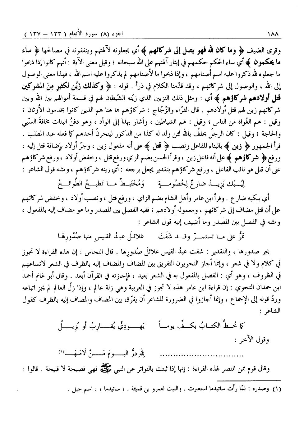 أَيْ يَبْكِيهِ ضَارِعٌ. وَقَرَأَ ابْنُ عَامِرٍ وَأَهْلُ الشَّامِ بِضَمِّ الزَّايِ، وَرَفْعِ قَتْلَ، وَنَصْبِ أَوْلَاد، وَخَفْضِ شُرَكَائِهِمْ عَلَى أَنَّ قَتْلَ مُضَافٌ إِلَى شُرَكَائِهِمْ، وَمَعْمُولُهُ أَوْلَادُهُمْ فَفِيهِ الْفَصْلُ بَيْنَ الْمَصْدَرِ وَمَا هُوَ مُضَافٌ إِلَيْهِ بِالْمَفْعُولِ، وَمِثْلُهُ فِي الْفَصْلِ بَيْنَ الْمَصْدَرِ وَمَا أُضِيفَ إِلَيْهِ قَوْلُ الشَّاعِرِ: