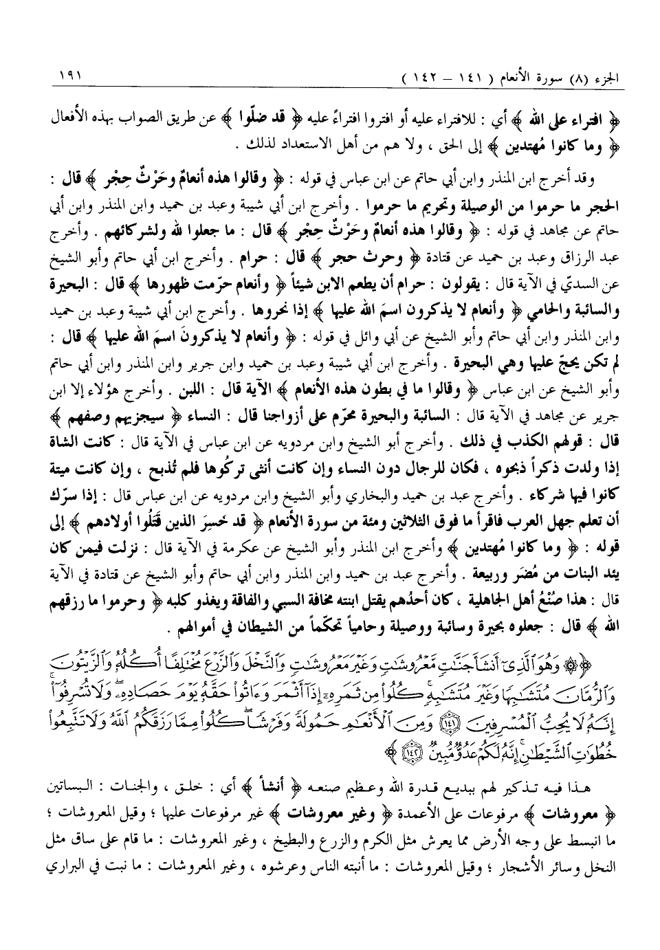 لَمْ تَكُنْ يُحَجُّ عَلَيْهَا وَهِيَ الْبَحِيرَةُ. وَأَخْرَجَ ابْنُ أَبِي شَيْبَةَ وَعَبْدُ بْنُ حُمَيْدٍ وَابْنُ جَرِيرٍ وَابْنُ الْمُنْذِرِ وَابْنُ أَبِي حَاتِمٍ وَأَبُو الشَّيْخِ عَنِ ابْنِ عَبَّاسٍ وَقالُوا مَا فِي بُطُونِ هذِهِ الْأَنْعامِ الْآيَةَ قَالَ: اللَّبَنُ. وَأَخْرَجَ هَؤُلَاءِ إِلَّا ابْنَ جَرِيرٍ عَنْ مُجَاهِدٍ فِي الْآيَةِ قَالَ: السَّائِبَةُ وَالْبَحِيرَةُ مُحَرَّمٌ عَلَى أَزْوَاجِنَا قَالَ: النِّسَاءُ سَيَجْزِيهِمْ وَصْفَهُمْ قَالَ: قَوْلَهُمُ الْكَذِبَ فِي ذَلِكَ. وَأَخْرَجَ أَبُو الشَّيْخِ وَابْنُ مَرْدَوَيْهِ عَنِ ابْنِ عَبَّاسٍ فِي الْآيَةِ قَالَ: كَانَتِ الشَّاةُ إِذَا وَلَدَتْ ذَكَرًا ذَبَحُوهُ، فَكَانَ لِلرِّجَالِ دُونَ النِّسَاءِ وَإِنْ كَانَتْ أُنْثَى تَرَكُوهَا فَلَمْ تُذْبَحْ، وَإِنْ كَانَتْ مَيْتَةً كَانُوا فِيهَا شُرَكَاءَ. وَأَخْرَجَ عَبْدُ بْنُ حُمَيْدٍ وَالْبُخَارِيُّ وَأَبُو الشَّيْخِ وَابْنُ مَرْدَوَيْهِ عَنِ ابْنِ عَبَّاسٍ قَالَ: إِذَا سَرَّكَ أَنْ تَعْلَمَ جَهْلَ الْعَرَبِ فَاقْرَأْ مَا فَوْقَ الثَلَاثِينَ وَمِائَةٍ مِنْ سُورَةِ الْأَنْعَامِ قَدْ خَسِرَ الَّذِينَ قَتَلُوا أَوْلادَهُمْ إِلَى قَوْلِهِ: وَما كانُوا مُهْتَدِينَ وَأَخْرَجَ ابْنُ الْمُنْذِرِ وَأَبُو الشَّيْخِ عَنْ عِكْرِمَةَ فِي الْآيَةِ قَالَ: نَزَلَتْ فِيمَنْ كَانَ يَئِدُ الْبَنَاتَ مِنْ مُضَرَ وَرَبِيعَةَ. وَأَخْرَجَ عَبْدُ بْنُ حُمَيْدٍ وَابْنُ الْمُنْذِرِ وَابْنُ أَبِي حَاتِمٍ وَأَبُو الشَّيْخِ عَنْ قَتَادَةَ فِي الْآيَةِ قَالَ: هَذَا صُنْعُ أَهْلِ الْجَاهِلِيَّةِ، كَانَ أَحَدُهُمْ يَقْتُلُ ابْنَتَهُ مَخَافَةَ السَّبْيِ وَالْفَاقَةِ وَيَغْذُو كَلْبَهُ وَحَرَّمُوا مَا رَزَقَهُمُ اللَّهُ قَالَ: جَعَلُوهُ بَحِيرَةً وَسَائِبَةً وَوَصِيلَةً وَحَامِيًا تَحَكُّمًا من الشيطان في أموالهم.