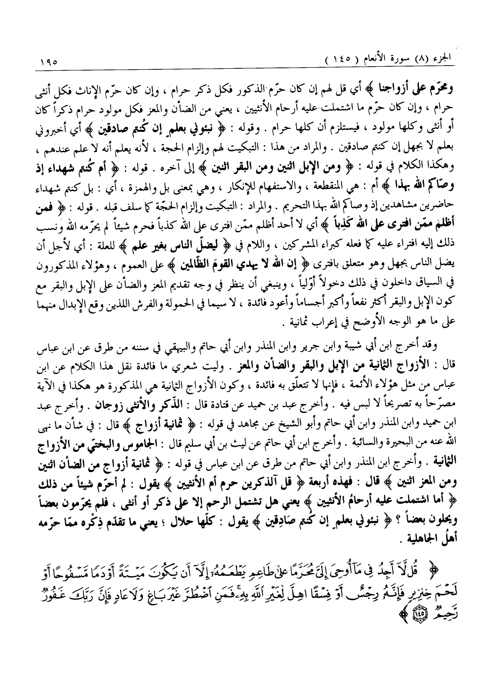 وَمُحَرَّمٌ عَلى أَزْواجِنا أَيْ قُلْ لَهُمْ إِنْ كَانَ حَرَّمَ الذُّكُورَ فَكُلُّ ذَكَرٍ حَرَامٌ، وَإِنْ كَانَ حَرَّمَ الْإِنَاثَ فَكُلُّ أُنْثَى حَرَامٌ، وَإِنْ كَانَ حَرَّمَ مَا اشْتَمَلَتْ عَلَيْهِ أَرْحَامُ الْأُنْثَيَيْنِ، يَعْنِي مِنَ الضَّأْنِ وَالْمَعْزِ فَكُلُّ مَوْلُودٍ حَرَامٌ ذَكَرًا كَانَ أَوْ أُنْثَى وَكُلُّهَا مَوْلُودٌ، فَيَسْتَلْزِمُ أن كلها حرام. وقوله: نَبِّئُونِي بِعِلْمٍ إِنْ كُنْتُمْ صادِقِينَ أَيْ أَخْبَرُونِي بِعِلْمٍ لَا بِجَهْلٍ إِنْ كُنْتُمْ صَادِقِينَ. وَالْمُرَادُ من هذا: التبكيت لهم وَإِلْزَامُ الْحُجَّةِ، لِأَنَّهُ يَعْلَمُ أَنَّهُ لَا عِلْمَ عِنْدَهُمْ، وَهَكَذَا الْكَلَامُ فِي قَوْلِهِ: وَمِنَ الْإِبِلِ اثْنَيْنِ وَمِنَ الْبَقَرِ اثْنَيْنِ إِلَى آخِرِهِ. قَوْلُهُ: أَمْ كُنْتُمْ شُهَداءَ إِذْ وَصَّاكُمُ اللَّهُ بِهذا أَمْ: هِيَ الْمُنْقَطِعَةُ، وَالِاسْتِفْهَامُ لِلْإِنْكَارِ، وَهِيَ بِمَعْنَى بل والهمزة، أي: بل كنتم شُهَدَاءَ حَاضِرِينَ مُشَاهِدِينَ إِذْ وَصَّاكُمُ اللَّهُ بِهَذَا التَّحْرِيمِ. وَالْمُرَادُ: التَّبْكِيتُ وَإِلْزَامُ الْحُجَّةِ كَمَا سَلَفَ قَبْلَهُ. قَوْلُهُ: فَمَنْ أَظْلَمُ مِمَّنِ افْتَرى عَلَى اللَّهِ كَذِباً أَيْ لَا أَحَدَ أَظْلَمُ مِمَّنِ افْتَرَى عَلَى اللَّهِ كَذِبًا فَحَرَّمَ شَيْئًا لَمْ يُحَرِّمْهُ اللَّهُ وَنَسَبَ ذَلِكَ إِلَيْهِ افْتِرَاءً عَلَيْهِ كَمَا فَعَلَهُ كُبَرَاءُ الْمُشْرِكِينَ، وَاللَّامُ فِي لِيُضِلَّ النَّاسَ بِغَيْرِ عِلْمٍ لِلْعِلَّةِ: أَيْ لِأَجْلِ أَنْ يُضِلَّ النَّاسَ بِجَهْلٍ وَهُوَ مُتَعَلِّقٌ بِافْتَرَى إِنَّ اللَّهَ لَا يَهْدِي الْقَوْمَ الظَّالِمِينَ عَلَى الْعُمُومِ، وَهَؤُلَاءِ الْمَذْكُورُونَ فِي السِّيَاقِ دَاخِلُونَ فِي ذَلِكَ دُخُولًا أَوَّلِيًّا، وَيَنْبَغِي أَنْ يُنْظَرَ فِي وَجْهِ تَقْدِيمِ الْمَعْزِ وَالضَّأْنِ عَلَى الْإِبِلِ وَالْبَقَرِ مَعَ كَوْنِ الْإِبِلِ وَالْبَقَرِ أَكْثَرَ نَفْعًا وَأَكْبَرَ أَجْسَامًا وَأَعْوَدَ فَائِدَةً، لَا سِيَّمَا فِي الْحَمُولَةِ وَالْفَرْشِ اللَّذَيْنِ وَقَعَ الْإِبْدَالُ مِنْهُمَا عَلَى مَا هُوَ الْوَجْهُ الْأَوْضَحُ فِي إِعْرَابِ ثَمَانِيَةَ.