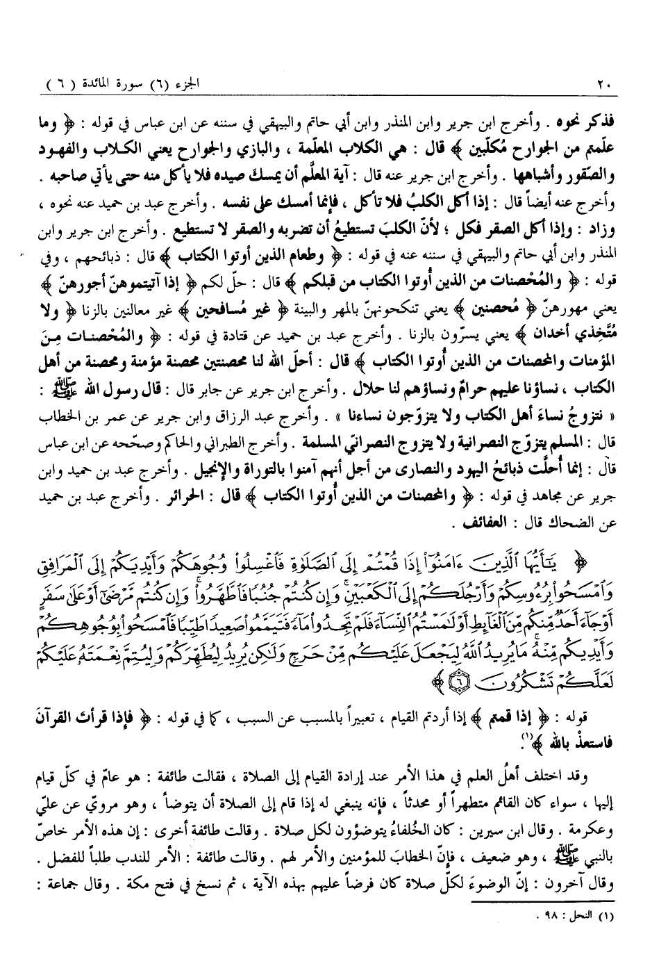 وَأَخْرَجَ عَنْهُ أَيْضًا قَالَ: إِذَا أَكَلَ الْكَلْبُ فَلَا تَأْكُلْ، فَإِنَّمَا أَمْسَكَ عَلَى نَفْسِهِ. وَأَخْرَجَ عَبْدُ بْنُ حُمَيْدٍ عَنْهُ نَحْوَهُ، وَزَادَ: وإذا أكل الصقر فكل لِأَنَّ الْكَلْبَ تَسْتَطِيعُ أَنْ تَضْرِبَهُ وَالصَّقْرَ لَا تَسْتَطِيعُ. وَأَخْرَجَ ابْنُ جَرِيرٍ وَابْنُ الْمُنْذِرِ وَابْنُ أَبِي حَاتِمٍ وَالْبَيْهَقِيُّ فِي سُنَنِهِ عَنْهُ فِي قَوْلِهِ: وَطَعامُ الَّذِينَ أُوتُوا الْكِتابَ قَالَ: ذَبَائِحُهُمْ، وَفِي قَوْلِهِ: وَالْمُحْصَناتُ مِنَ الَّذِينَ أُوتُوا الْكِتابَ مِنْ قَبْلِكُمْ قَالَ: حِلٌّ لَكُمْ إِذا آتَيْتُمُوهُنَّ أُجُورَهُنَّ يَعْنِي مُهُورَهُنَّ مُحْصِنِينَ يَعْنِي تَنْكِحُونَهُنَّ بِالْمَهْرِ والبينة غَيْرَ مُسافِحِينَ غير معالنين بِالزِّنَا وَلا مُتَّخِذِي أَخْدانٍ يَعْنِي يُسِرُّونَ بِالزِّنَا. وَأَخْرَجَ عَبْدُ بْنُ حُمَيْدٍ عَنْ قَتَادَةَ فِي قَوْلِهِ: وَالْمُحْصَناتُ مِنَ الْمُؤْمِناتِ وَالْمُحْصَناتُ مِنَ الَّذِينَ أُوتُوا الْكِتابَ قَالَ: أَحَلَّ اللَّهُ لَنَا مُحْصَنَتَيْنِ مُحْصَنَةٌ مُؤْمِنَةٌ وَمُحْصَنَةٌ مِنْ أَهْلِ الْكِتَابِ، نِسَاؤُنَا عَلَيْهِمْ حَرَامٌ وَنِسَاؤُهُمْ لَنَا حَلَالٌ. وَأَخْرَجَ ابْنُ جَرِيرٍ عَنْ جَابِرٍ قَالَ: قَالَ رَسُولُ اللَّهِ صَلَّى اللَّهُ عَلَيْهِ وسلّم: