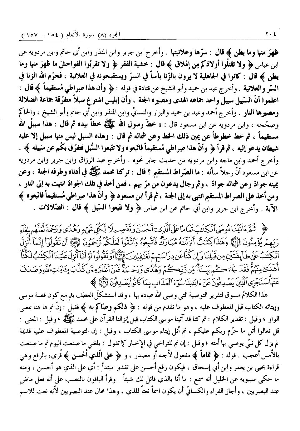 ثُمَّ آتَيْنا مُوسَى الْكِتابَ تَماماً عَلَى الَّذِي أَحْسَنَ وَتَفْصِيلاً لِكُلِّ شَيْءٍ وَهُدىً وَرَحْمَةً لَعَلَّهُمْ بِلِقاءِ رَبِّهِمْ يُؤْمِنُونَ (154) وَهذا كِتابٌ أَنْزَلْناهُ مُبارَكٌ فَاتَّبِعُوهُ وَاتَّقُوا لَعَلَّكُمْ تُرْحَمُونَ (155) أَنْ تَقُولُوا إِنَّما أُنْزِلَ الْكِتابُ عَلى طائِفَتَيْنِ مِنْ قَبْلِنا وَإِنْ كُنَّا عَنْ دِراسَتِهِمْ لَغافِلِينَ (156) أَوْ تَقُولُوا لَوْ أَنَّا أُنْزِلَ عَلَيْنَا الْكِتابُ لَكُنَّا أَهْدى مِنْهُمْ فَقَدْ جاءَكُمْ بَيِّنَةٌ مِنْ رَبِّكُمْ وَهُدىً وَرَحْمَةٌ فَمَنْ أَظْلَمُ مِمَّنْ كَذَّبَ بِآياتِ اللَّهِ وَصَدَفَ عَنْها سَنَجْزِي الَّذِينَ يَصْدِفُونَ عَنْ آياتِنا سُوءَ الْعَذابِ بِما كانُوا يَصْدِفُونَ (157)