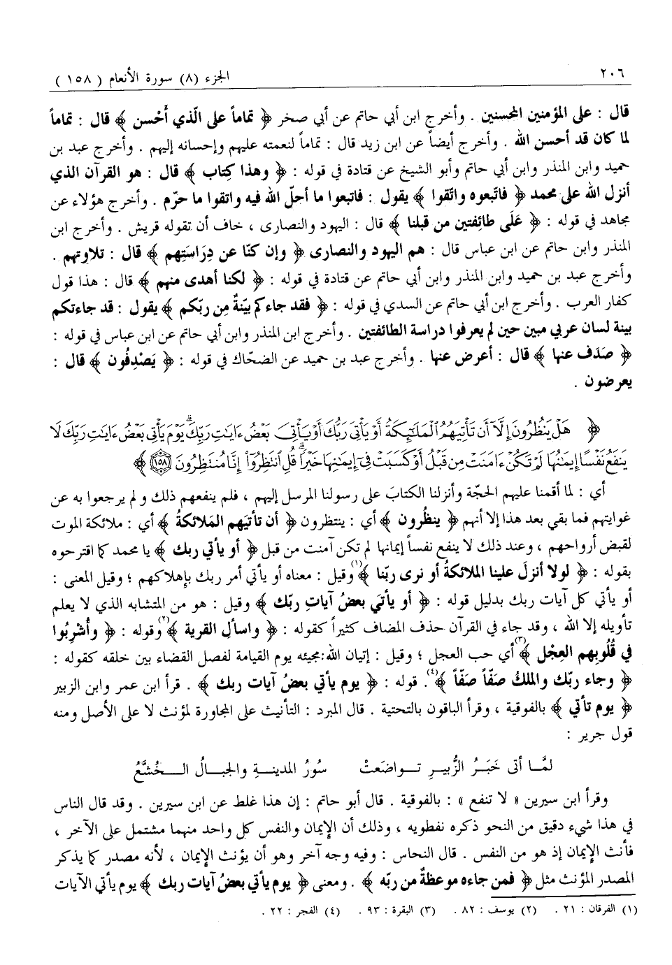 قَالَ: عَلَى الْمُؤْمِنِينَ الْمُحْسِنِينَ. وَأَخْرَجَ ابْنُ أَبِي حَاتِمٍ عَنْ أَبِي صَخْرٍ تَماماً عَلَى الَّذِي أَحْسَنَ قَالَ: تَمَامًا لِمَا كَانَ قَدْ أَحْسَنَ اللَّهُ. وَأَخْرَجَ أَيْضًا عَنِ ابْنِ زَيْدٍ قَالَ: تَمَامًا لِنِعْمَتِهِ عَلَيْهِمْ وَإِحْسَانِهِ إِلَيْهِمْ. وَأَخْرَجَ عَبْدُ بْنُ حُمَيْدٍ وَابْنُ الْمُنْذِرِ وَابْنُ أَبِي حَاتِمٍ وَأَبُو الشَّيْخِ عَنْ قَتَادَةَ فِي قَوْلِهِ: وَهذا كِتابٌ قال: هو القرآن الذي أنزل اللَّهُ عَلَى مُحَمَّدٍ فَاتَّبِعُوهُ وَاتَّقُوا يَقُولُ: فَاتَّبِعُوا مَا أَحَلَّ اللَّهُ فِيهِ وَاتَّقُوا مَا حَرَّمَ. وَأَخْرَجَ هَؤُلَاءِ عَنْ مُجَاهِدٍ فِي قَوْلِهِ: عَلى طائِفَتَيْنِ مِنْ قَبْلِنا قَالَ: الْيَهُودُ وَالنَّصَارَى، خَافَ أَنْ تَقُولَهُ قُرَيْشٌ. وَأَخْرَجَ ابْنُ الْمُنْذِرِ وَابْنُ حَاتِمٍ عَنِ ابْنِ عَبَّاسٍ قَالَ: هُمُ الْيَهُودُ وَالنَّصَارَى وَإِنْ كُنَّا عَنْ دِراسَتِهِمْ قَالَ: تِلَاوَتِهِمْ.
