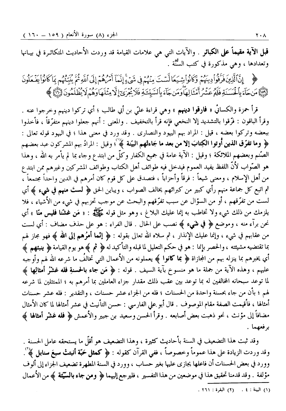 وَما تَفَرَّقَ الَّذِينَ أُوتُوا الْكِتابَ إِلَّا مِنْ بَعْدِ مَا جاءَتْهُمُ الْبَيِّنَةُ «1» وَقِيلَ: الْمُرَادُ بِهِمُ الْمُشْرِكُونَ عَبَدَ بَعْضُهُمُ الصَّنَمَ وَبَعْضُهُمُ الْمَلَائِكَةَ وَقِيلَ: الْآيَةُ عَامَّةٌ فِي جَمِيعِ الْكُفَّارِ وَكُلِّ مَنِ ابْتَدَعَ وَجَاءَ بِمَا لَمْ يَأْمُرْ بِهِ اللَّهُ، وَهَذَا هُوَ الصَّوَابُ لِأَنَّ اللَّفْظَ يُفِيدُ الْعُمُومَ فَيَدْخُلُ فِيهِ طَوَائِفُ أَهْلِ الْكِتَابِ وَطَوَائِفُ الْمُشْرِكِينَ وَغَيْرُهُمْ مِمَّنِ ابْتَدَعَ مِنْ أَهْلِ الْإِسْلَامِ، وَمَعْنَى شِيَعًا: فِرَقًا وَأَحْزَابًا، فَتَصْدُقُ عَلَى كُلِّ قَوْمٍ كَانَ أَمْرُهُمْ فِي الدِّينِ وَاحِدًا مُجْتَمِعًا، ثُمَّ اتَّبَعَ كُلُّ جَمَاعَةٍ مِنْهُمْ رَأْيَ كَبِيرٍ مِنْ كُبَرَائِهِمْ يُخَالِفُ الصَّوَابَ، وَيُبَايِنُ الْحَقَّ لَسْتَ مِنْهُمْ فِي شَيْءٍ أَيْ لَسْتَ مِنْ تَفَرُّقِهِمْ، أَوْ مِنَ السُّؤَالِ عَنْ سَبَبِ تَفَرُّقِهِمْ وَالْبَحْثِ عَنْ مُوجِبِ تَحَزُّبِهِمْ فِي شَيْءٍ مِنَ الْأَشْيَاءِ، فَلَا يَلْزَمُكَ مِنْ ذَلِكَ شَيْءٌ وَلَا تُخَاطَبُ بِهِ إِنَّمَا عَلَيْكَ الْبَلَاغُ، وهو مثل قوله صلّى الله عليه وَسَلَّمَ: «مَنْ غَشَّنَا فَلَيْسَ مِنَّا» أَيْ نَحْنُ بُرَآءُ مِنْهُ، وَمَوْضِعُ فِي شَيْءٍ نَصْبٌ عَلَى الْحَالِ. قَالَ الْفَرَّاءُ: هُوَ عَلَى حَذْفِ مُضَافٍ: أَيْ لَسْتَ مِنْ عِقَابِهِمْ فِي شَيْءٍ، وَإِنَّمَا عَلَيْكَ الْإِنْذَارُ، ثُمَّ سَلَّاهُ اللَّهُ تَعَالَى بِقَوْلِهِ: إِنَّما أَمْرُهُمْ إِلَى اللَّهِ فَهُوَ مُجَازٍ لَهُمْ بِمَا تَقْتَضِيهِ مَشِيئَتُهُ، وَالْحَصْرُ بِإِنَّمَا: هُوَ فِي حُكْمِ التَّعْلِيلِ لِمَا قَبْلَهُ وَالتَّأْكِيدِ لَهُ ثُمَّ هُوَ يَوْمَ الْقِيَامَةِ يُنَبِّئُهُمْ أَيْ يُخْبِرُهُمْ بِمَا ينزله بهم من المجازاة بِما كانُوا يعملونه مِنَ الْأَعْمَالِ الَّتِي تُخَالِفُ مَا شَرَعَهُ اللَّهُ لَهُمْ وَأَوْجَبَهُ عَلَيْهِمْ، وَهَذِهِ الْآيَةُ مِنْ جُمْلَةِ مَا هُوَ مَنْسُوخٌ بِآيَةِ السَّيْفِ. قَوْلُهُ: مَنْ جاءَ بِالْحَسَنَةِ فَلَهُ عَشْرُ أَمْثالِها لَمَّا تَوَعَّدَ سُبْحَانَهُ الْمُخَالِفِينَ لَهُ بِمَا تَوَعَّدَ بَيَّنَ عَقِبَ ذَلِكَ مِقْدَارَ جَزَاءِ الْعَامِلِينَ بِمَا أَمَرَهُمْ بِهِ الْمُمْتَثِلِينَ لِمَا شَرَعَهُ لَهُمْ بِأَنَّ مَنْ جَاءَ بِحَسَنَةٍ وَاحِدَةٍ مِنَ الْحَسَنَاتِ فَلَهُ مِنَ الْجَزَاءِ عَشْرُ حَسَنَاتٍ، وَالتَّقْدِيرُ: فَلَهُ عَشْرُ حَسَنَاتٍ أَمْثَالُهَا، فَأُقِيمَتِ الصِّفَةُ مَقَامَ الْمَوْصُوفِ. قَالَ أَبُو عَلِيٍّ الْفَارِسِيُّ: حَسُنَ التَّأْنِيثُ فِي عَشْرِ أَمْثَالِهَا لَمَّا كَانَ الْأَمْثَالُ مُضَافًا إِلَى مُؤَنَّثٍ، نَحْو ذَهَبَتْ بَعْضُ أَصَابِعِهِ. وَقَرَأَ الْحَسَنُ وَسَعِيدُ بْنُ جُبَيْرٍ وَالْأَعْمَشُ فَلَهُ عَشْرُ أَمْثالِها بِرَفْعِهِمَا.