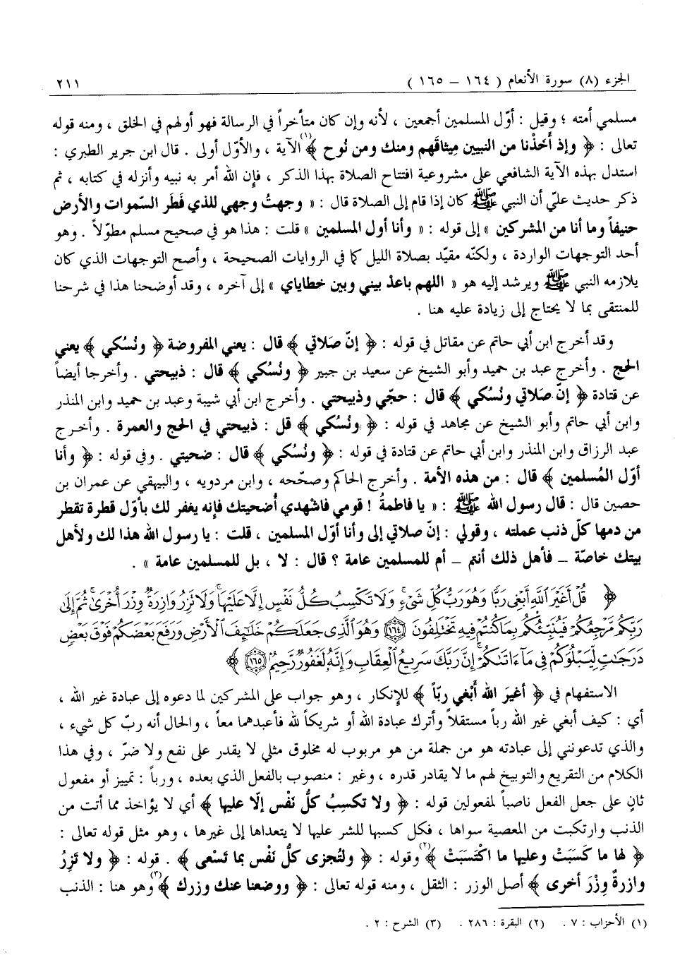 قُلْ أَغَيْرَ اللَّهِ أَبْغِي رَبًّا وَهُوَ رَبُّ كُلِّ شَيْءٍ وَلا تَكْسِبُ كُلُّ نَفْسٍ إِلاَّ عَلَيْها وَلا تَزِرُ وازِرَةٌ وِزْرَ أُخْرى ثُمَّ إِلى رَبِّكُمْ مَرْجِعُكُمْ فَيُنَبِّئُكُمْ بِما كُنْتُمْ فِيهِ تَخْتَلِفُونَ (164) وَهُوَ الَّذِي جَعَلَكُمْ خَلائِفَ الْأَرْضِ وَرَفَعَ بَعْضَكُمْ فَوْقَ بَعْضٍ دَرَجاتٍ لِيَبْلُوَكُمْ فِي مَا آتاكُمْ إِنَّ رَبَّكَ سَرِيعُ الْعِقابِ وَإِنَّهُ لَغَفُورٌ رَحِيمٌ (165)