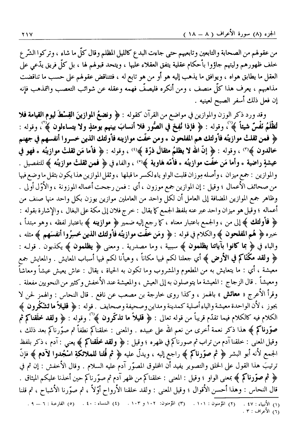 وَقَدْ وَرَدَ ذِكْرُ الْوَزْنِ وَالْمَوَازِينِ فِي مَوَاضِعَ مِنَ الْقُرْآنِ كَقَوْلِهِ: وَنَضَعُ الْمَوازِينَ الْقِسْطَ لِيَوْمِ الْقِيامَةِ فَلا تُظْلَمُ نَفْسٌ شَيْئاً «1» ، وَقَوْلِهِ: فَإِذا نُفِخَ فِي الصُّورِ فَلا أَنْسابَ بَيْنَهُمْ يَوْمَئِذٍ وَلا يَتَساءَلُونَ «2» ، وَقَوْلِهِ: